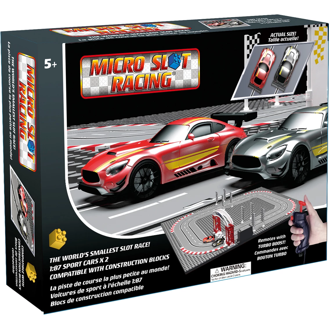 Have a blast with the worldβs smallest slot car race from Jupiter Creations! Includes 2 x 1:87 scale sport cars with headlights. The track is built into panels that are compatible with common construction blocks. Model: 20001.