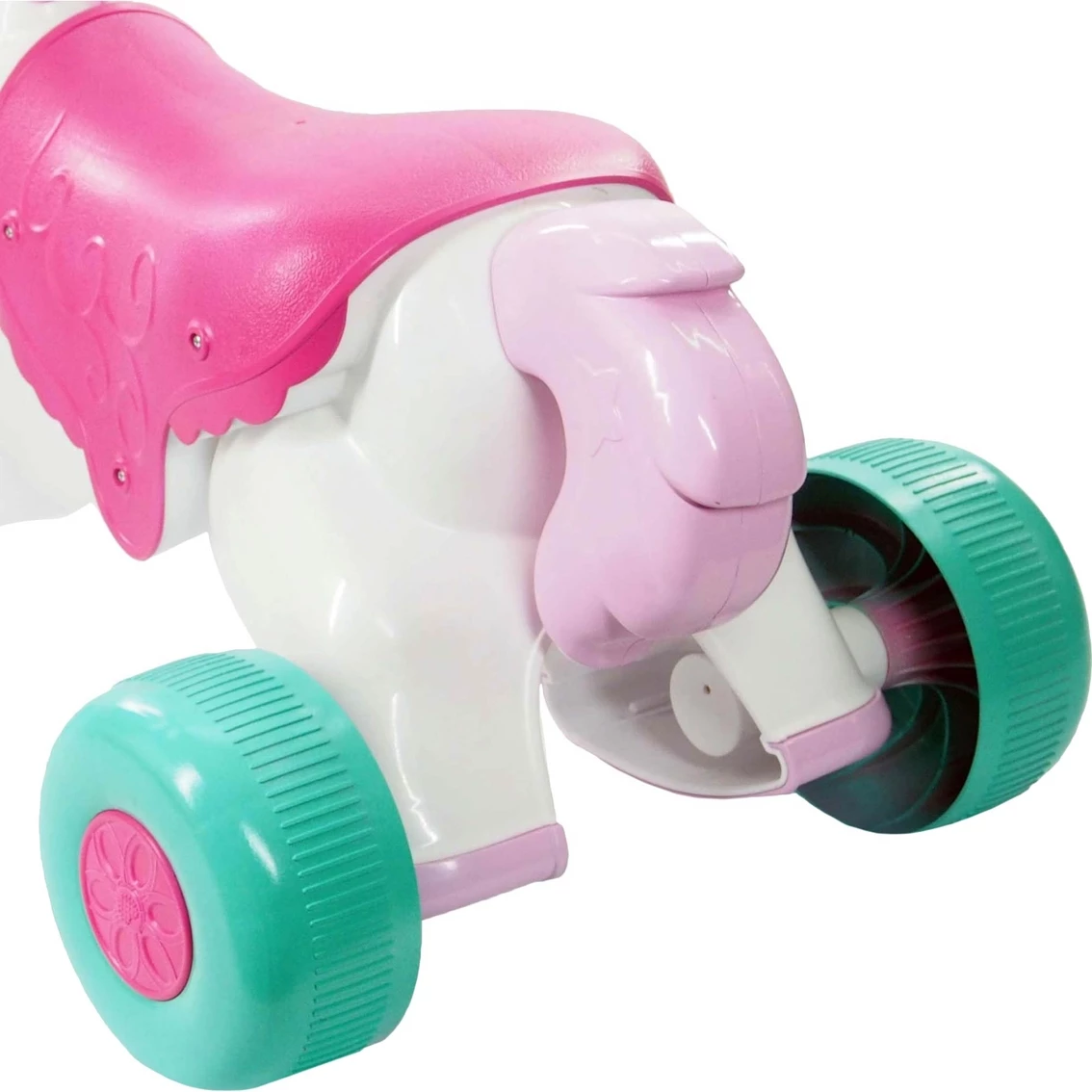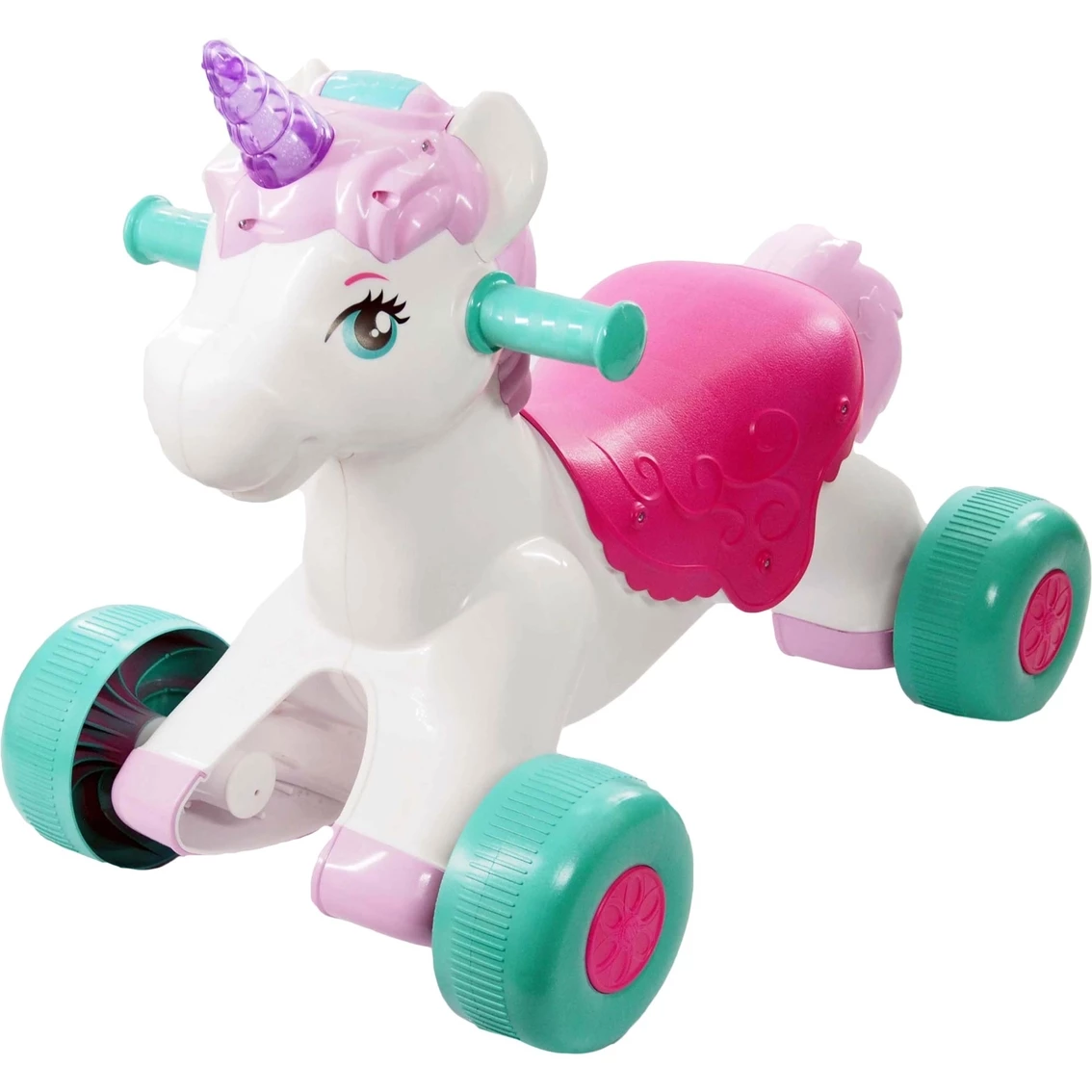Get ready for a magical adventure! This cute unicorn ride-on toy from Kiddieland plays fun sounds and lively music. Hear realistic trotting and whinny sounds with flashing colorful lights! Model: G661148608710.