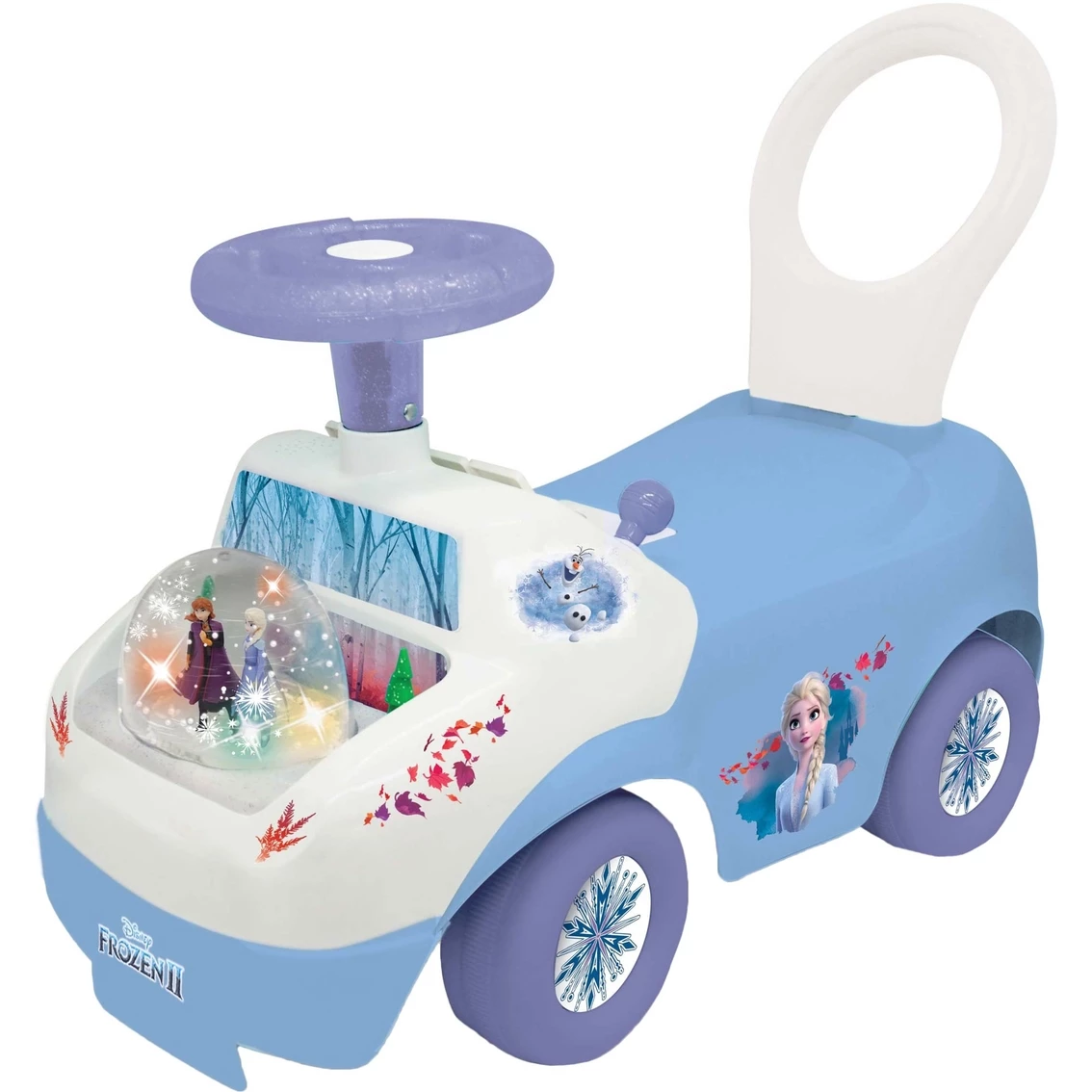 This ride-on toy from Kiddieland plays sounds and has flashing lights! It features the original Frozen 2 movie soundtrack titled “Into The Unknown.” See snow fly inside the snow globe with music and colorful lights! The dashboard with interactive electronic activities features fun sounds. This toy offers sturdy and durable construction for hours of safe riding fun. Perfect for ages 12 to 36 months, this ride-on toy has a weight capacity of 50 lb. Model: 203290.