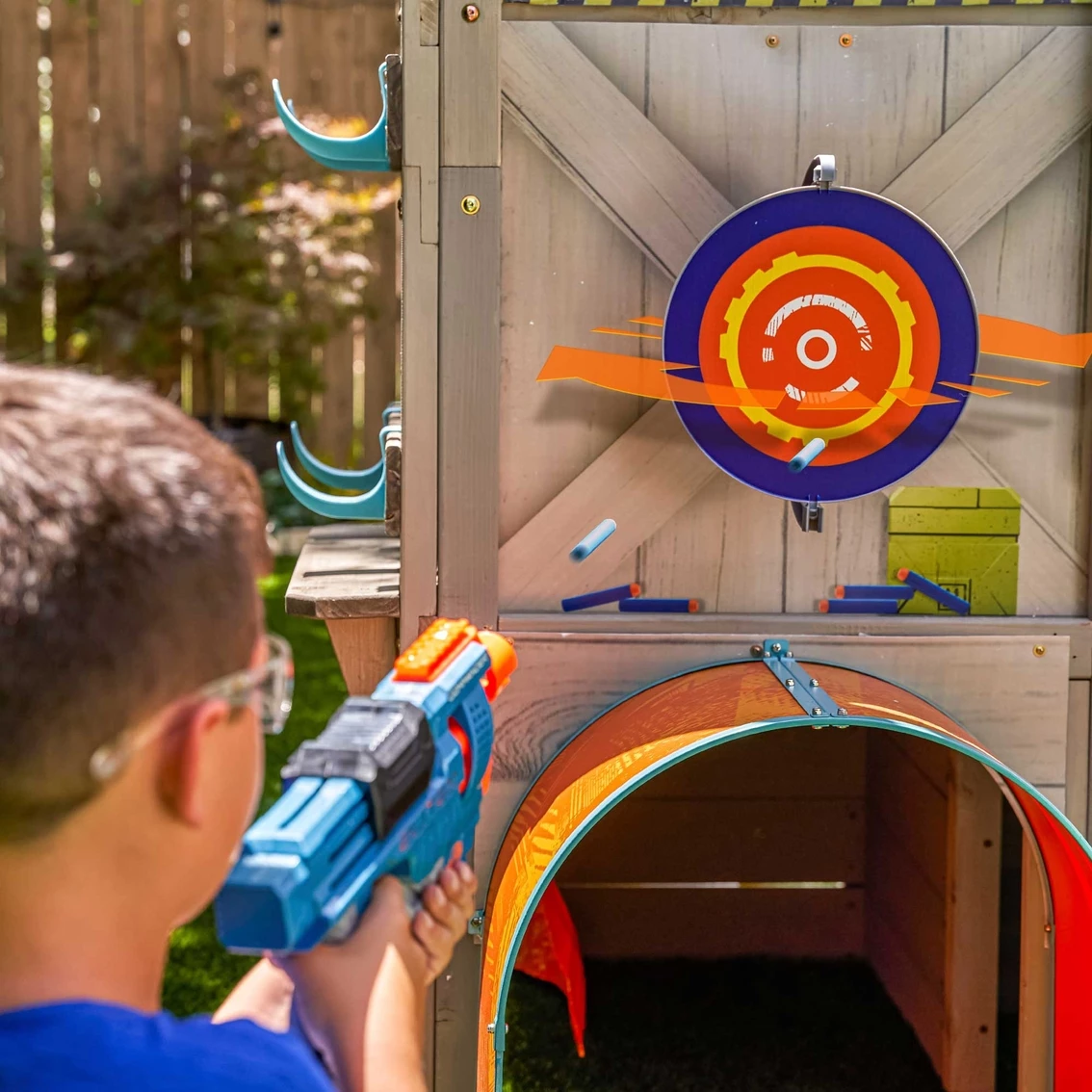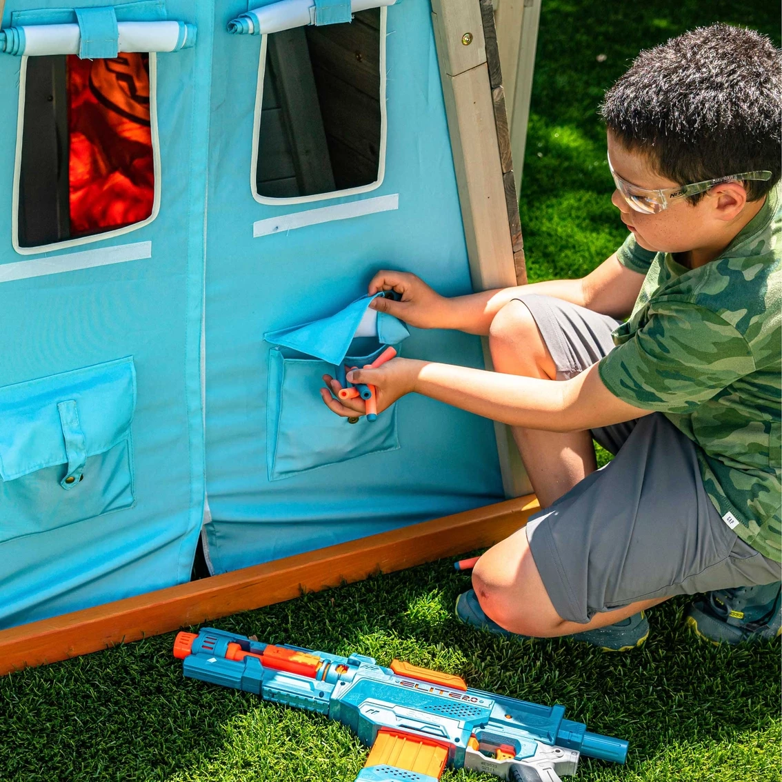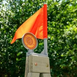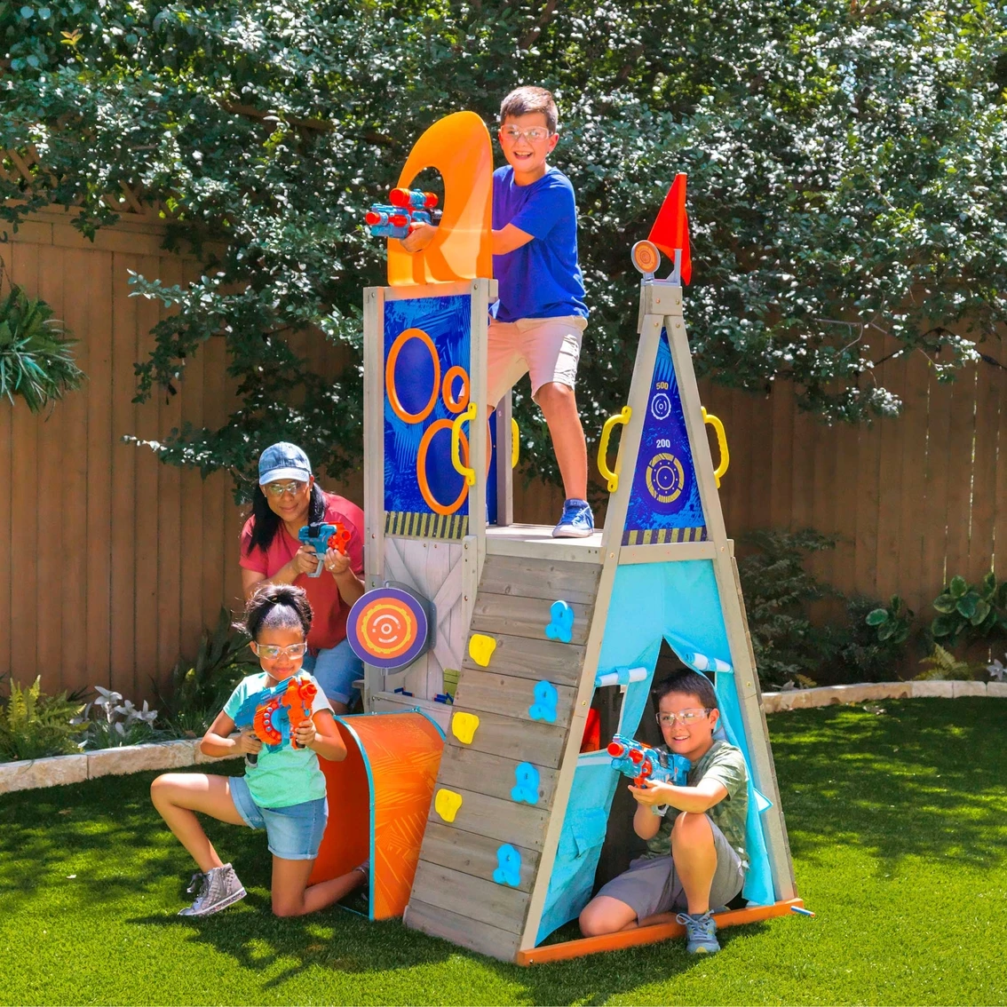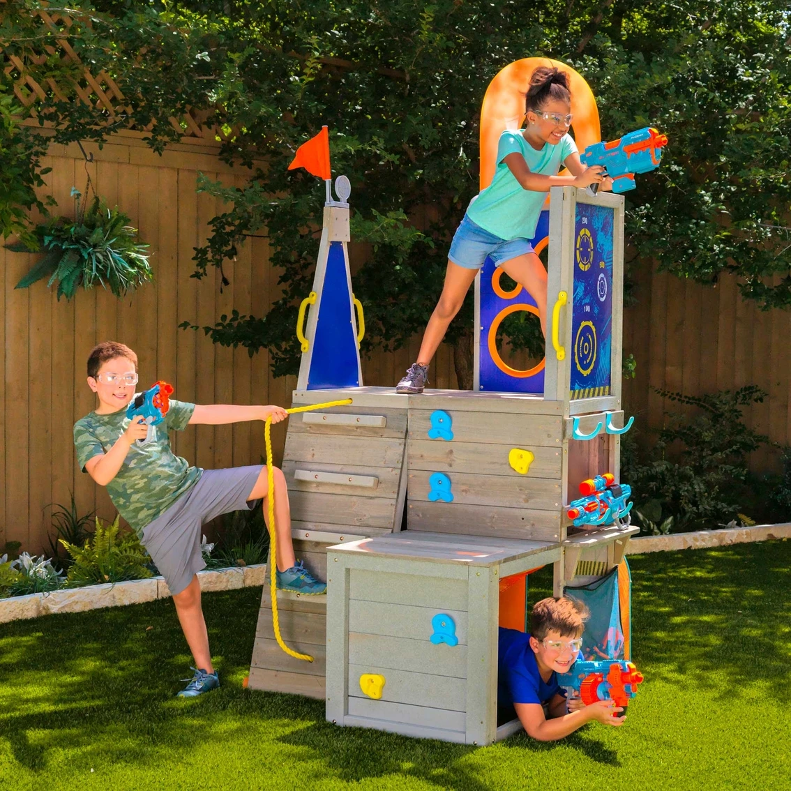 Brace for battle and defend your territory with the KidKraft Nerf Scout Defense Post. This elevated fort-like structure has amazing 360-degree fun. Guard yourself with the shield, crawl tunnel and bunker. Store blasters and darts in handy built-in storage hooks and a mesh bag so they’re ready when you need them. Make blaster battles a true challenge with spinning and spring-loaded targets to release the flag when captured. Rock climbing, rope rappelling and belly crawling complete the obstacle course vibe. The backyard becomes a riveting adventure any time you scale the Nerf Scout Defense Post by KidKraft. Model: P280123E.