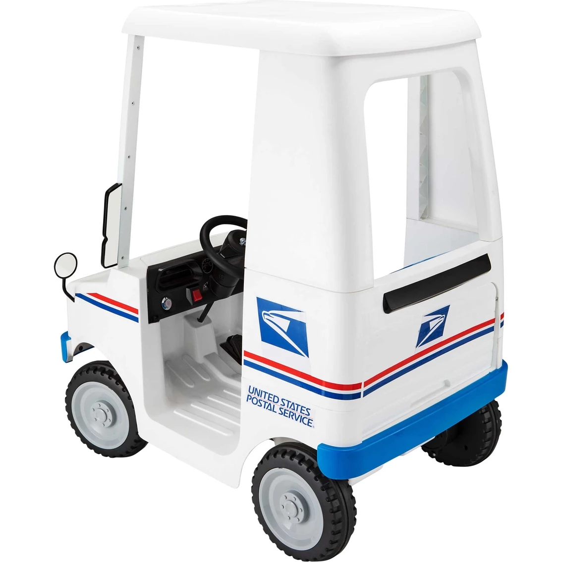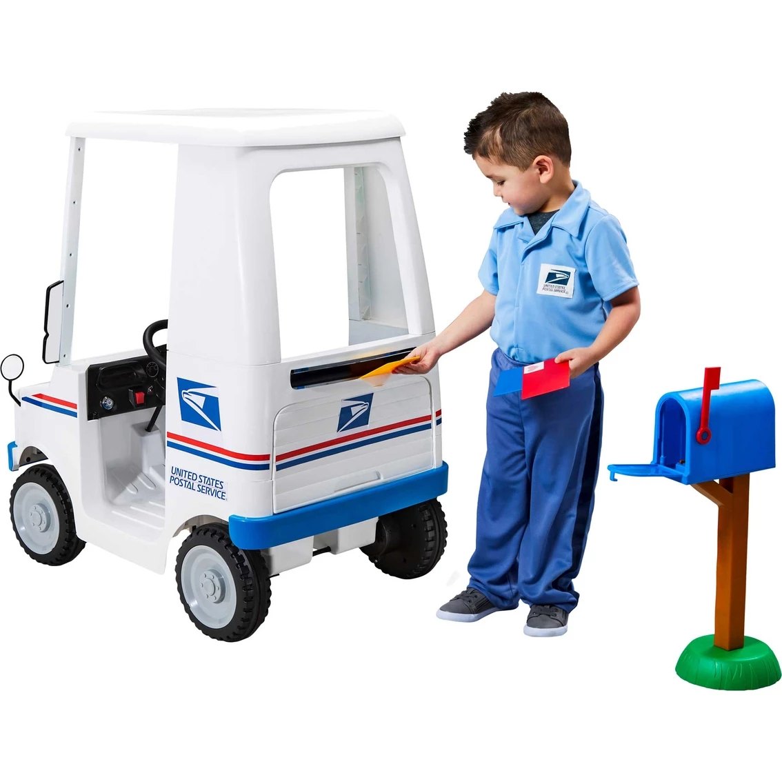 Special delivery! First-class playtime fun is on the way with the USPS Mail Delivery Truck Ride-On Toy by KidTrax. This delightful kid-sized mail carrier features a mail slot, opening rear door, working headlights and horn — just like a real mail delivery truck! Your child can even play their favorite tunes on their route thanks to the FM radio/MP3 player input. Plus, the Mail Delivery Truck comes with a mailbox and three plastic envelopes for extra delivery fun. Real foot pedal acceleration creates a lifelike driving experience, while Power Trax rubber traction strip tires offer a smooth ride. And don’t forget, this ride-on toy comes with a rechargeable battery, so the fun never has to stop for long! Your playtime fun is in the mail with the USPS Mail Delivery Truck Ride-On Toy by KidTrax. Sits one rider between the ages of 3 and 5 with a maximum weight of 60 lb. Model: KT1608.