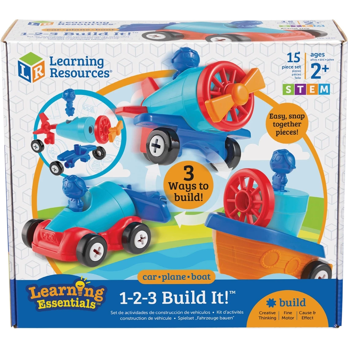 The Learning Resources 123 Build it Car Plane Boat is one construction toy that can be built three different ways! Help teach early STEM skills, like engineering, with mix-and-match pieces that create a car, airplane and tugboat (one at a time.) Model: LER2840.