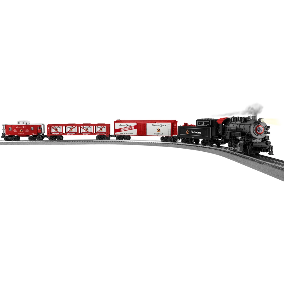 There’s something about the classics and this Lionel Anheuser Busch LionChief set is nothing short of that. Including an Anheuser Busch 0-8-0 Locomotive and tender, a Budweiser Reefer, an Anheuser Busch Vat car, and an Anheuser Busch Caboose, this set is sure to be a staple piece on your layout. ADULT COLLECTIBLE NOT INTENDED FOR SALE TO INDIVIDUALS UNDER 21 YEARS OF AGE This product is intended for purchase by persons of legal alcohol purchase and drinking age. Budweiser, Bud are registered trademarks of Anheuser-Busch, Inc., used under license by Lionelยฎ SET INCLUDES: Anheuser Busch 0-8-0 Locomotive and tender Budweiser Reefer Anheuser Busch Vat car Anheuser Busch Caboose Eight pieces of O36 curved FasTrack Two FasTrack 10″ straight track sections One LionChief FasTrack Terminal section One Plug-Expand-Play Power Lock-on section Wall-pack power supply LionChief remote for locomotive LOCOMOTIVE FEATURES: Electric locomotive controlled by included LionChief remote, LionChief Universal Remote (sold separately) or Bluetooth LionChief app Lionel Voice Control (LVC) – run your locomotive by speaking commands into your phone via LionChief App Voice Streaming & Recording (VSR) – record or live stream your own custom announcements via LionChief App RailSounds RC sound system with steam chuffing and background sounds, whistle, bell, and user-activated announcements Operating headlight Powerful maintenance-free motor On/Off switch for smoke and sound Operating couplers FREIGHT CAR FEATURES: Operating couplers Opening door on reefer with Anheuser Busch crate insert Illuminated caboose LIONCHIEF REMOTE FEATURES: Forward and reverse speed control knob Three buttons for whistle sound, and special announcements Requires three AAA alkaline batteries (not included) PRODUCT SPECIFICATIONS Gauge: O Gauge Power: Electric Min Curve: O31 Dimensions: Length: 47 รยผ (on track) Most Recent Catalog: 2022 Big Book https://www.lionelsupport.com/warranty WARRANTY TEXT: This Lionel product, including all mechanical and electrical components, moving parts, motors and structural components, with the exception of TRACTION TIRES are warranted to the original owner-purchaser for a period of one year from the original date of purchase against original defects in materials or workmanship when purchased through a Lionel Authorized Retailer.