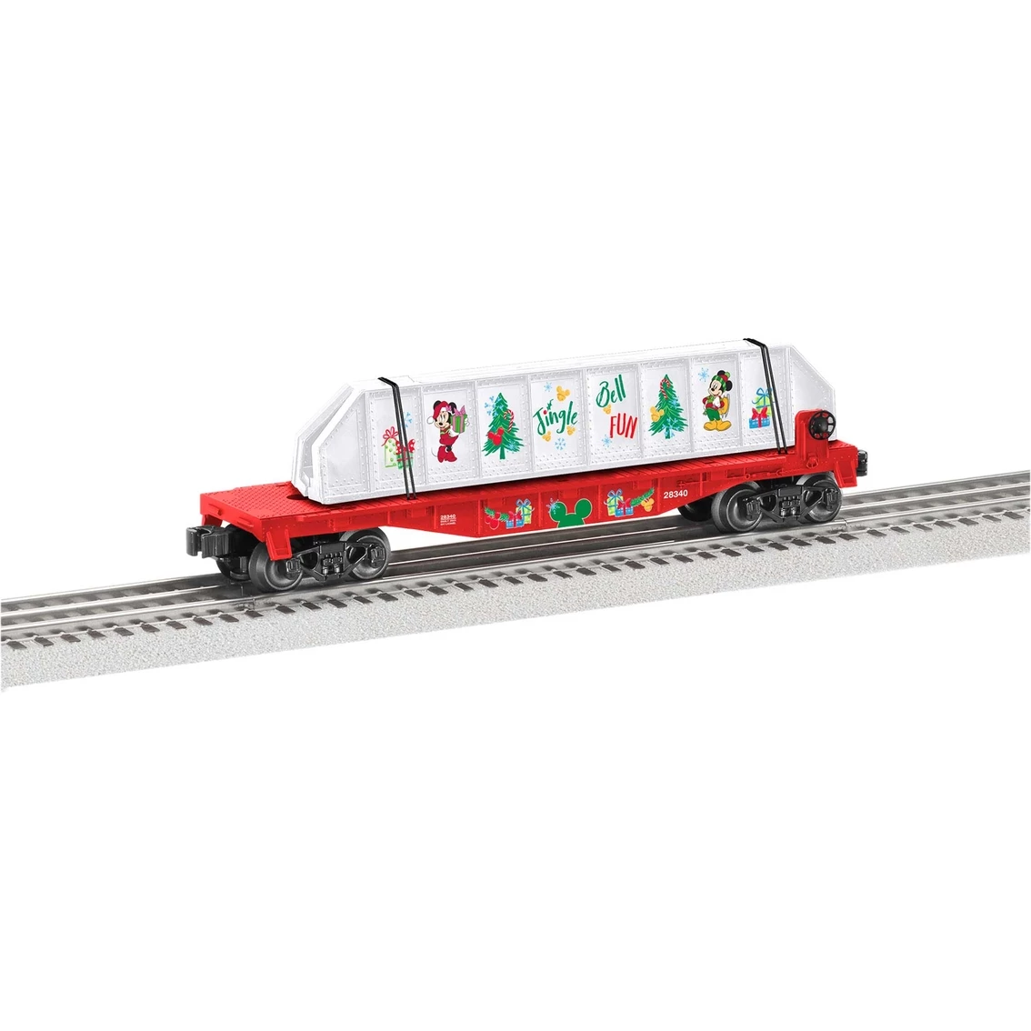 Lionel Disney Mickey & Friends Christmas O Gauge Model Train Flatcar with Girder Bridge is sure to get you in the holiday spirit. Mickey & Minnie are dressed in their finest apparel as they decorate Christmas trees and wrap packages in festive paper with ribbon bows. Flat Car embellishes images of Mickey & Minnie Mouse, Mickey Head silhouettes and includes a girder bridge that is painted in Christmas colors of red, green and white. Features include die-cast metal trucks, operating couplers, metal base with screws and two removable girders. Be sure to add the Mickey & Friends Christmas Flatcar with Girder Bridge to your Disney collection or train layout.
