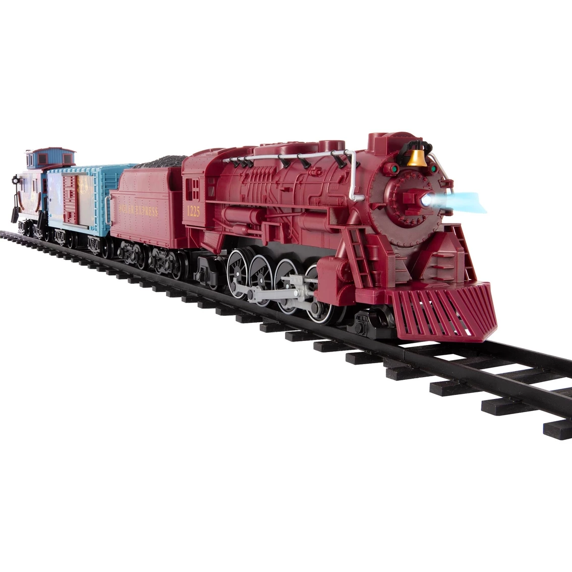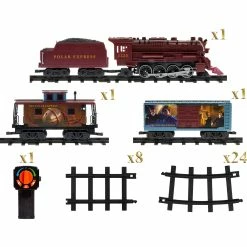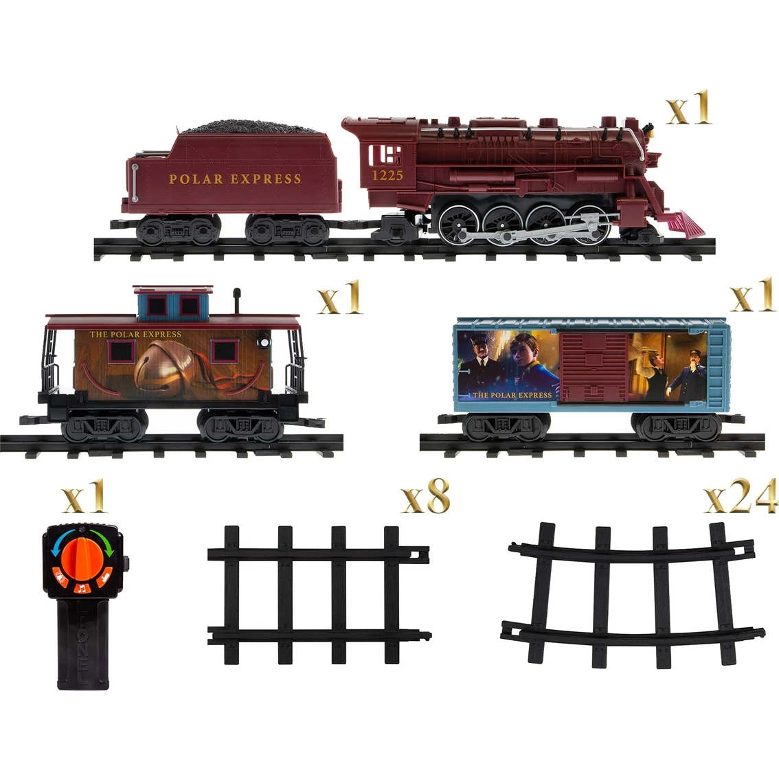Lionel Warner Brothers The Polar Express Freight Battery-Operated Train Set with Remote will aid in prompt deliveries this holiday season. This thirty-seven piece ready to play battery operated train set features authentic train sounds, special announcements, wireless remote and a working headlight. These large-scale trains operate in both forward and reverse directions, are powered by an easy to operate RC controller and designed for children ages four years and up. The exclusive track system allows you to create a circle, a rectangle or an oval layout. Train Set requires six (6) C Cell batteries and three (3) AAA batteries for operation that are not included. Set includes: Battery Powered General Style Locomotive Tender Boxcar, Caboose (24) Curved Plastic Track Pieces, eight (8) Straight Plastic Track Pieces and RC Remote Control. Recommended for ages 4 years and up Adult assembly required. CHOKING HAZARD: Small parts, not for children under 3 years of age.
