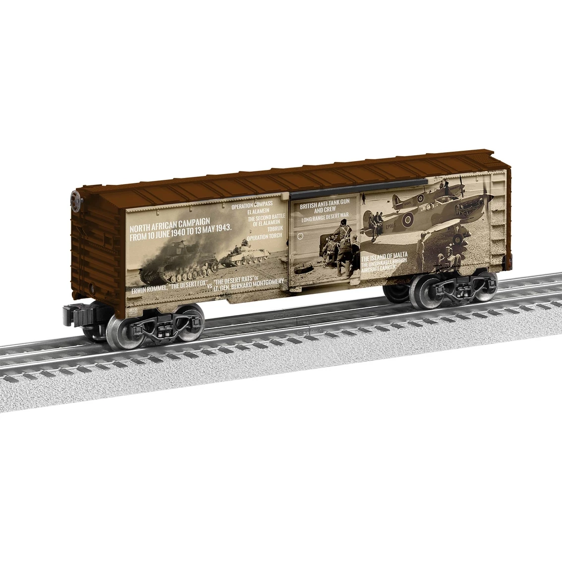 Lionel WWII Africa Campaign O Gauge Model Train Boxcar showcases historical North African Campaign images from the Western Desert Campaign, the Tunisia Campaign and the Operation Torch.