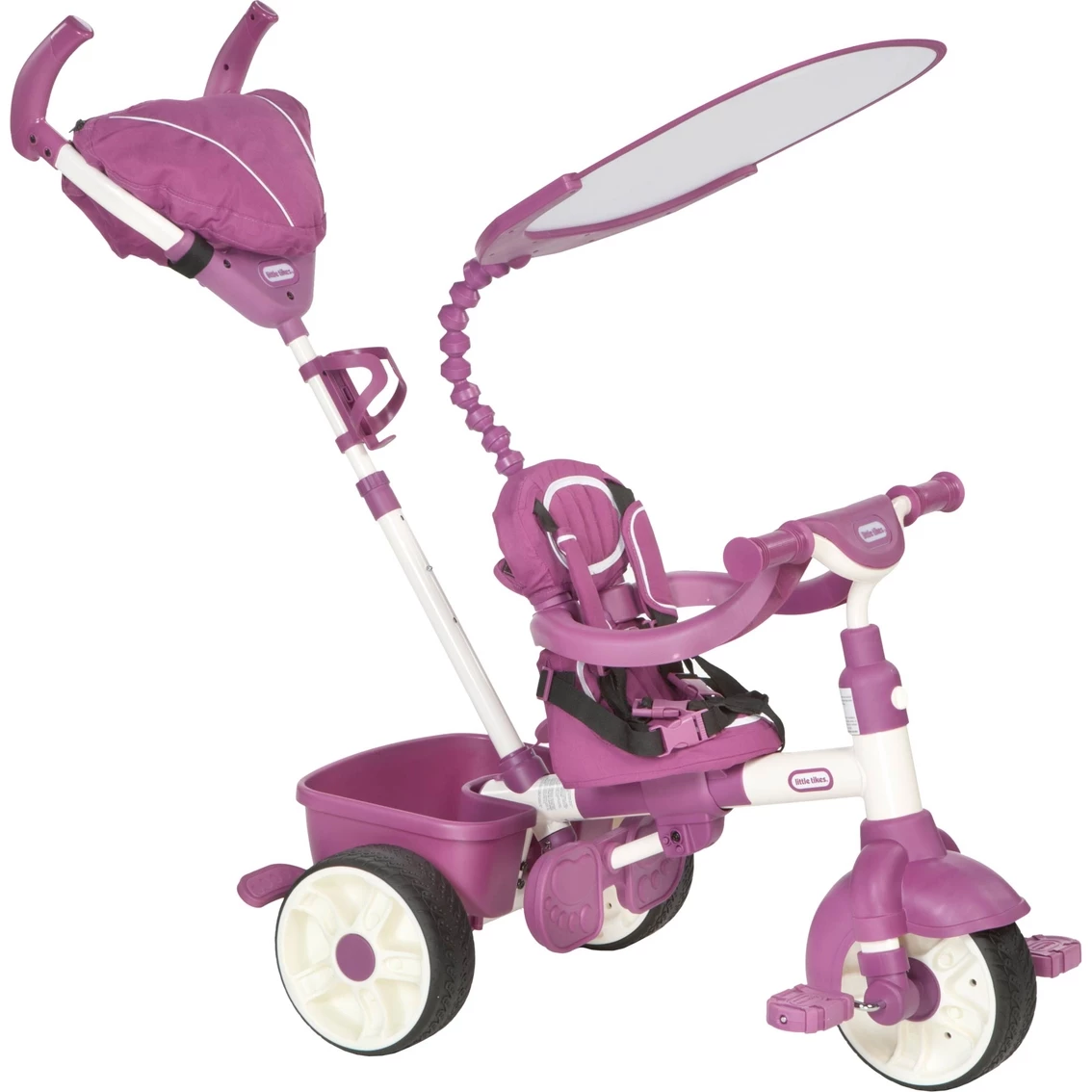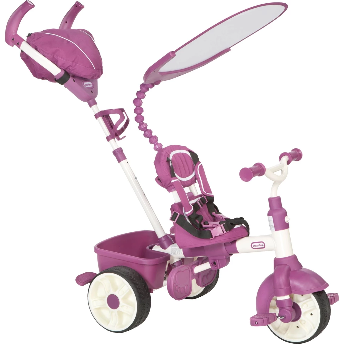 This Little Tikes 4-in-1 Sports Edition Trike was designed with the parent and child in mind to increase comfort, convenience and ease of use. It offers four stages to grow with your child: Guided (9+ months), Learning (12+ months), Developing (18+ months) and Independent (36+ months). The ergonomic push handle is adjustable and detachable. Model: 634369C.