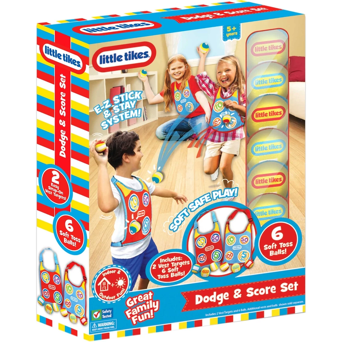 The Little Tikes Dodge & Score Set is the perfect soft plush game of dodge ball. It promotes active play of quick moves, hand and eye co-ordination and strategy as players try to dodge each throw. Each player will throw the soft toss balls and try to stick them to their opponent’s vest adding up points. The vest has an e-z stick and stay system meaning if the ball sticks, it is a score! this two-player game includes 2 easy strap-on vest targets & 6 soft toss balls. A soft and safe game that can be played inside and outside year-round, fun for the entire family! Perfect for ages 5 and up. Model: G820016940905.