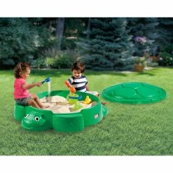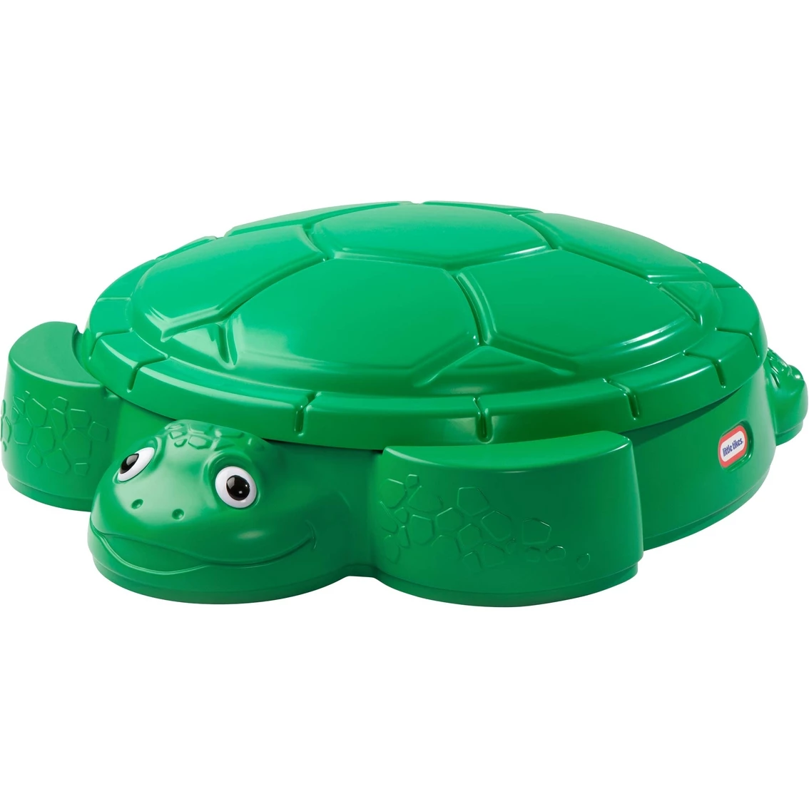 The Little Tikes Turtle Sandbox is a classic turtle with a friendly molded-in face and molded-in details on the bottom to encourage kids to dig. Two seats molded on the outside of the sandbox do not take away any of the sand play area. Turtle shell is a removable lid that covers sand area. A great outdoor toy for promoting creative and social play. Model: 632884M.