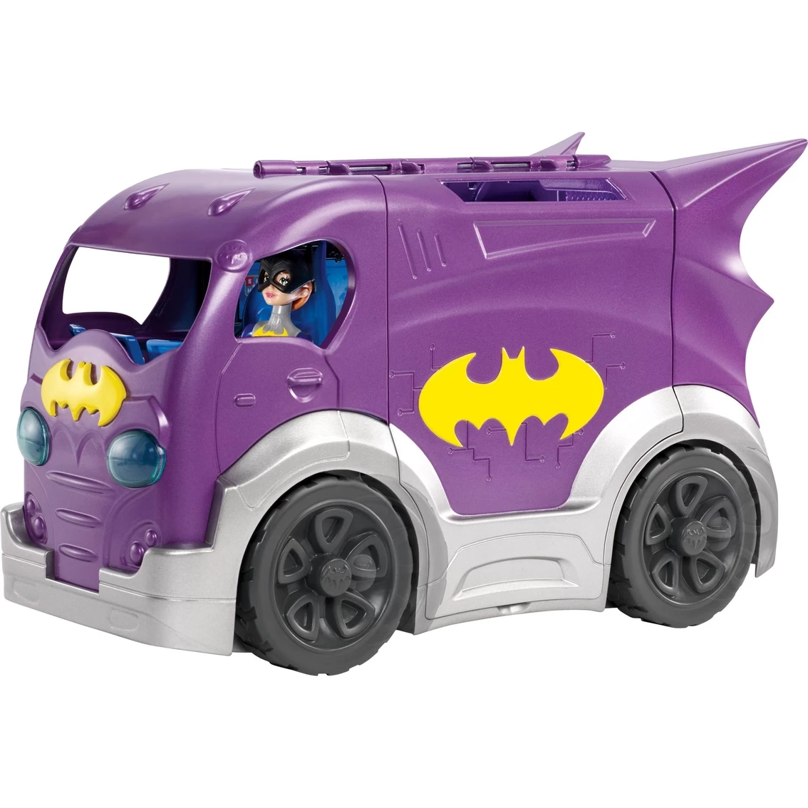 Batgirl action figure is ready to ride into action with her headquarters on wheels! With so many cool features and gadgets, this transforming vehicle showcases the tech genius’ skills and abilities. When a mission comes in, Batgirl action figure can hop into the driver’s seat and take off in the van. Its wheels roll, and its design is signature Batgirl — cool purple with blue accents and a yellow bat-shaped symbol on the side. When it’s time to set up headquarters, park, flip down the back and open the side up to set up two stories of mission fun. The driver’s seat becomes a cockpit that can swing around to face the passenger seat for a two-person briefing before the information screens (other action figures sold separately). The roof hides mission gear for Batgirl action figure that includes body armor, gauntlets, a bat-shaped mask and bat-shaped wings — simply snap the pieces on over her signature Super Hero suit to head into adventure. And the back reveals a net launcher, perfect for nabbing your villain! Simply load the net projectile and push the button to launch. Then close up and roll on to the next mission to play out all kinds of adventures and unleash your inner hero. Includes Batgirl action figure and transforming vehicle with second outfit and net launcher. Colors and decorations may vary.