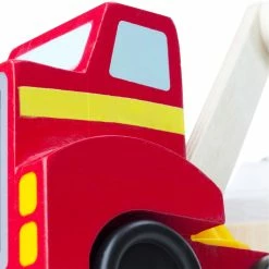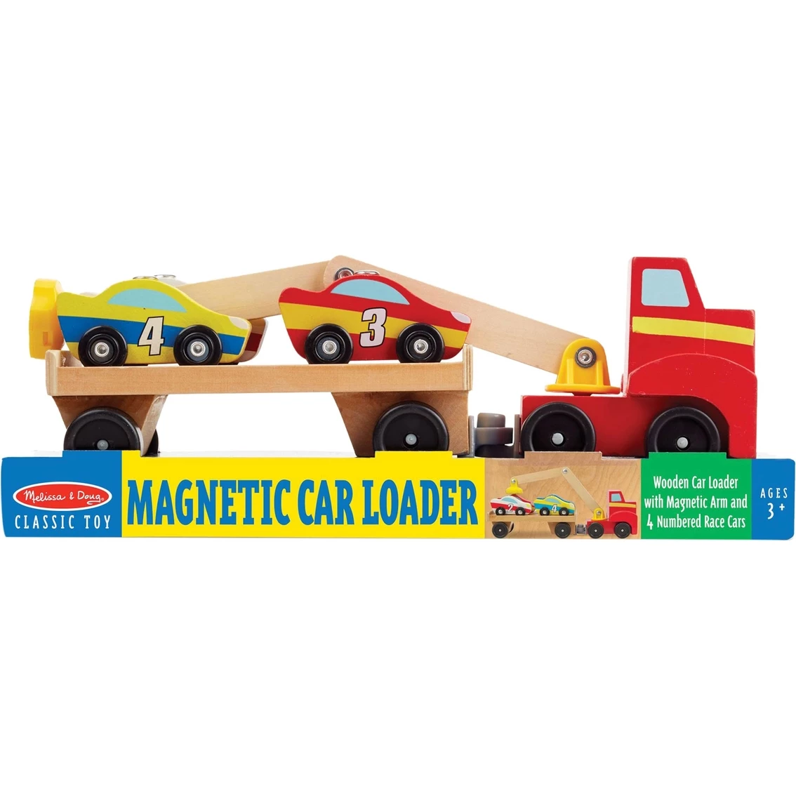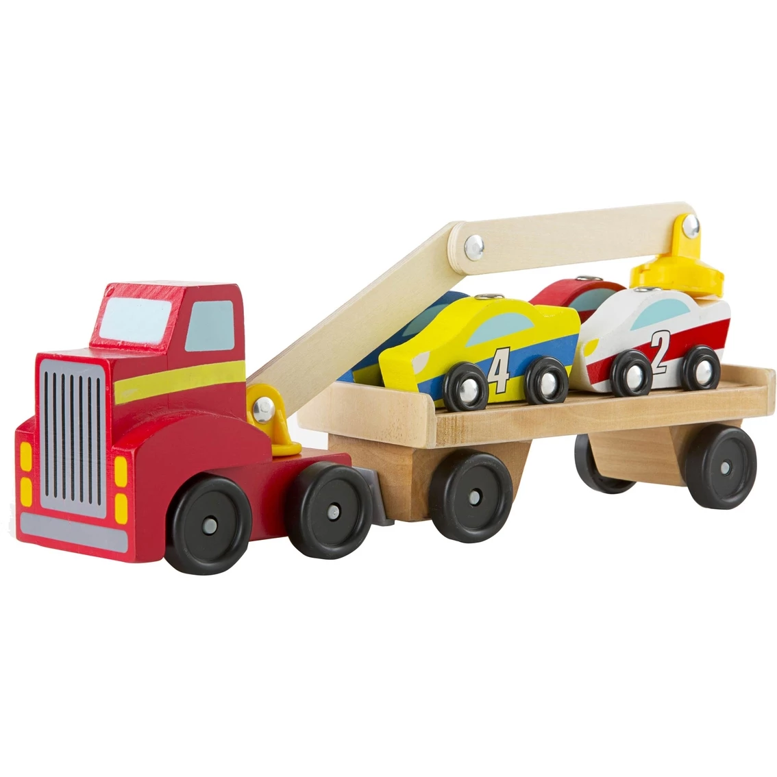 The Melissa & Doug Magnetic Car Loader will give your young car and truck lover hours of endless play possibilities. This big red rig has a magnetic arm that can reach every car on its trailer. Maneuvering the articulated arm is easy to do and great for fine motor skills and hand-eye coordination. Take the four magnet topped cars for a ride and then unload them at their destination. Each car has a unique color, stripe and number to inspire playful counting, sorting and sequencing activities. They also have sturdy wooden chassis and smooth rolling wheels to stand up to countless deliveries and road trips. Model: 9390.