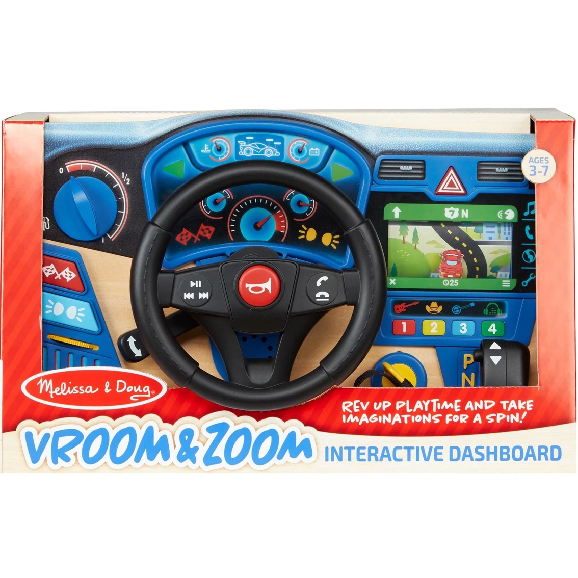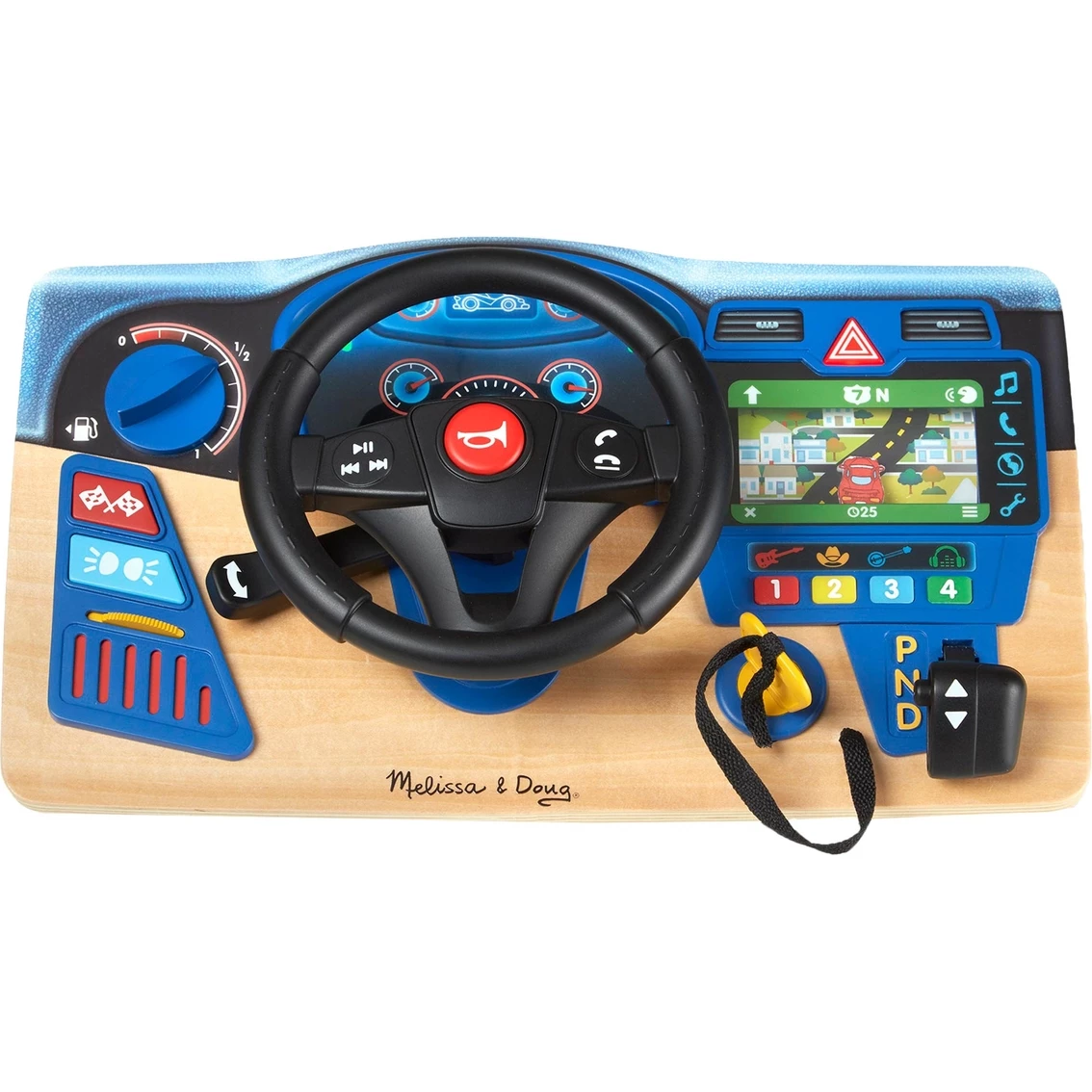 Rev up playtime and take imaginations for a spin with this realistic play steering wheel mounted on a sturdy wooden dashboard with lights, sound effects, and moving parts, including a scrolling GPS from Melissa & Doug!