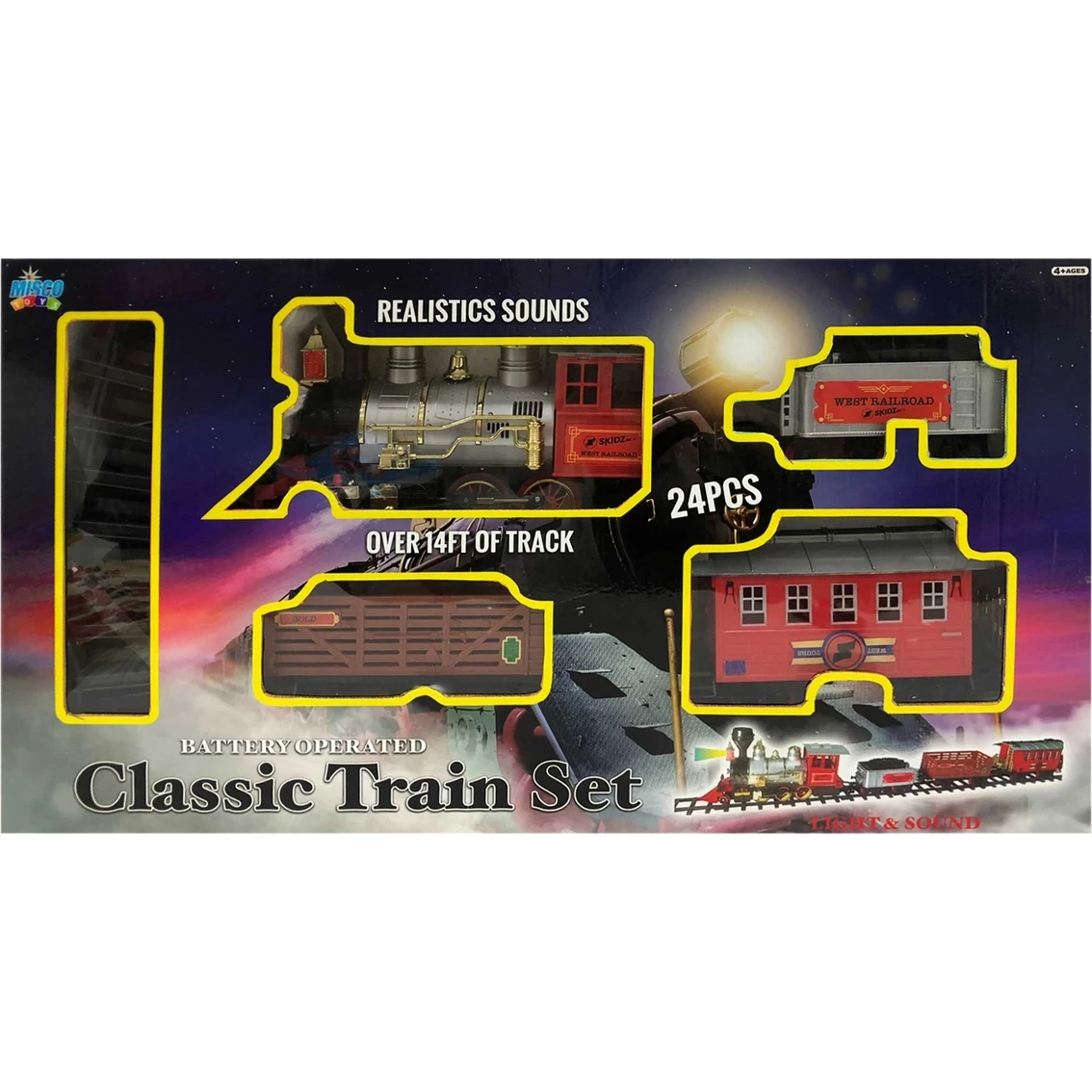 This is a classic battery operated 24-piece train set. Up to 14ft. of track. Lights and sounds. Batteries not included. Ages 4yrs+ A great gift idea for birthdays, holidays, or anything in between. Model: MT1120/6