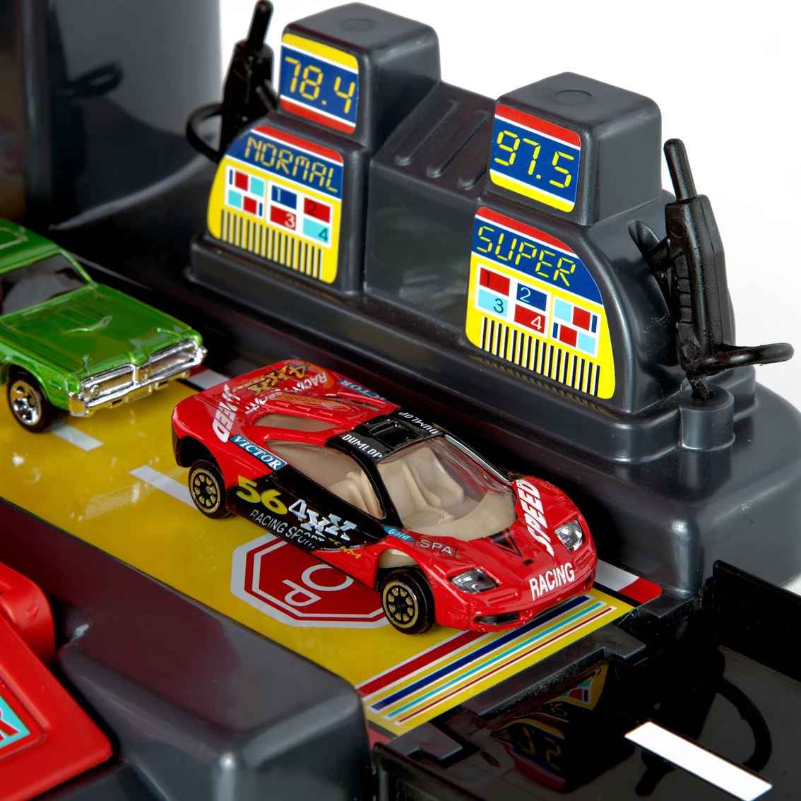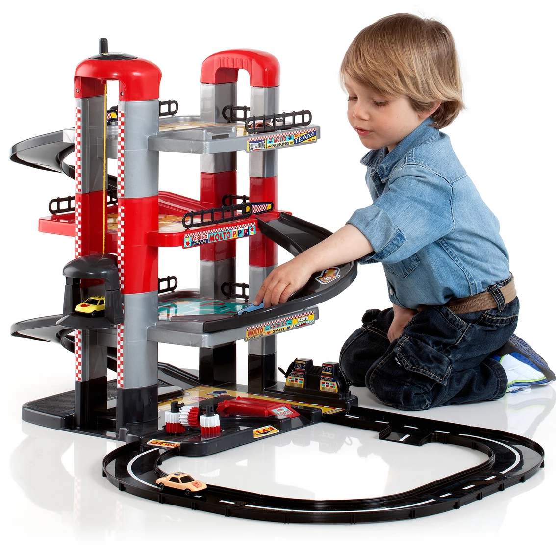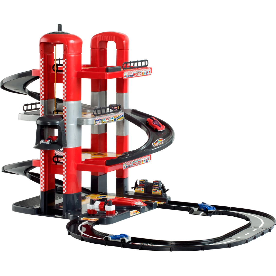 The Molto 4-Story Parking Playset is a great new garage with loads of fun and hours of play value. It features a firm base, stable construction and easy assembly. The playset includes tracks to build a 4-story parking garage, 2 cars, a car lift, a car wash, an inspection ramp, petrol pumps and lots of accessories. Recommended for ages 3 and up. Warning: Choking Hazard — Small parts. Not for children under 3 years of age. Model: 198793.