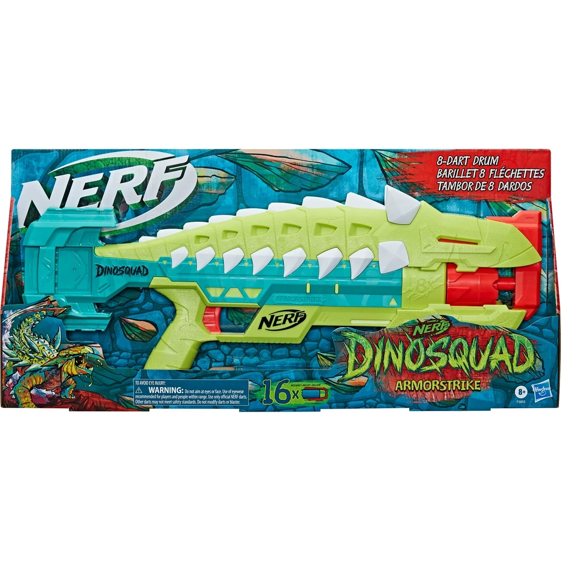 Team up with legendary dinosaurs as a member of the elite DinoSquad! Harness the extraordinary force of the greatest dinosaurs of all and blast into amazing adventures! Charge into action with the Nerf DinoSquad Armorstrike blaster! It features an awesome dinosaur design, capturing the look of an Anklyosaurus dinosaur. Launch 8 darts in a row from the blaster’s 8-dart rotating drum to show your targets that you have plenty of dino-power! Pump the drop grip to prime the blaster and take advantage of its below-the-barrel design to steady your aim. The blaster includes 16 Official Nerf Elite foam darts — 8 darts to load the drum and 8 darts for reloads. And you can keep those 8 backup darts nearby because the blaster has onboard dart storage. To play, load the drum, move the drop grip backward and forward to prime the blaster, and pull the trigger to unleash 1 dart. Eyewear recommended (not included). No batteries required. Nerf and all related properties are trademarks of Hasbro. Model: F5855.