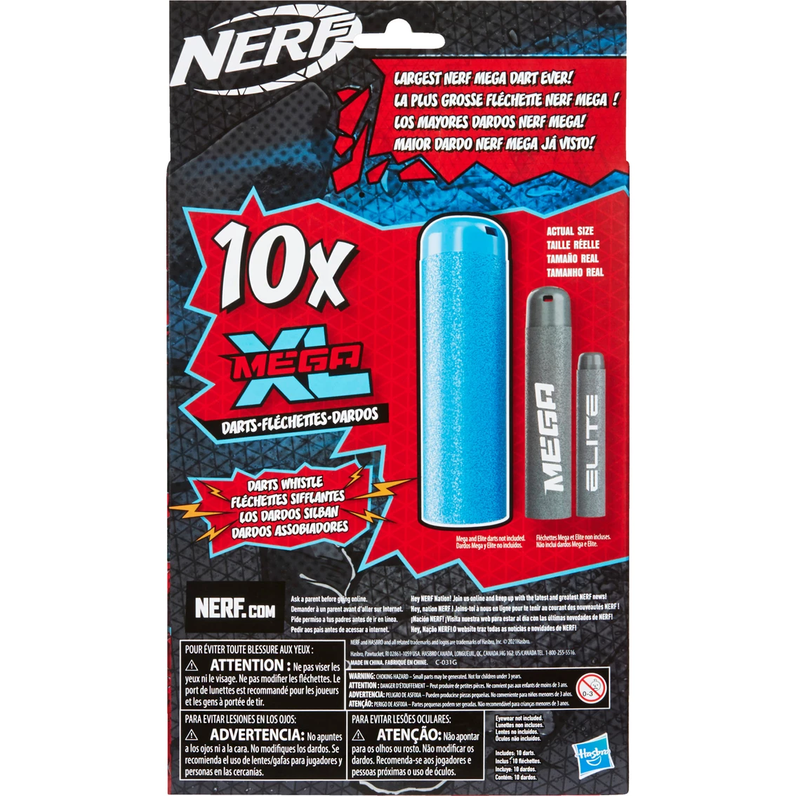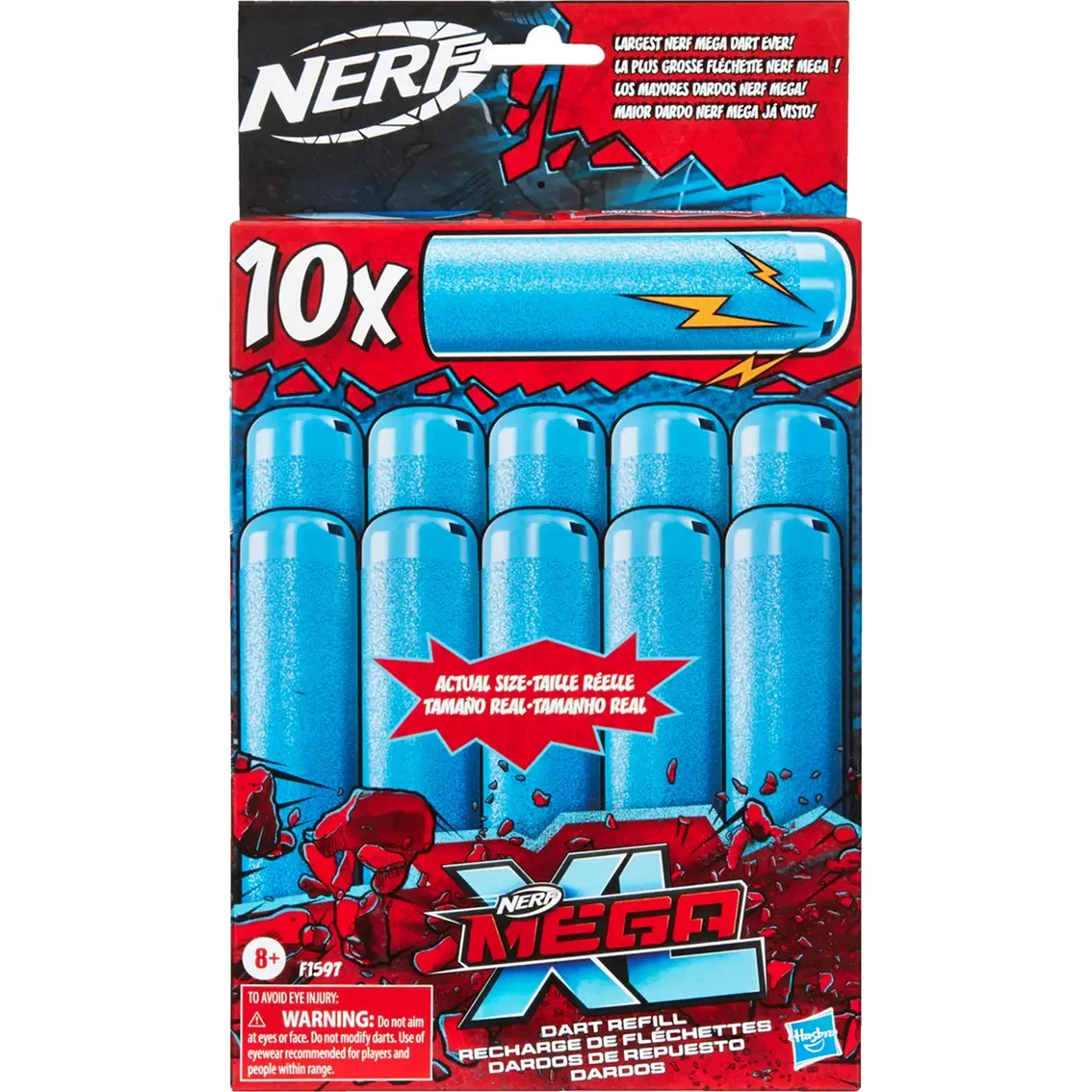 When you’re ready to make your Nerf battles bigger than ever, gear up with Nerf Mega XL blasters, featuring the largest Nerf Mega darts ever! And when these monster-sized Nerf Mega XL foam darts fly through the air, they make a whistling sound. The competition will see and hear them coming and will know that you’re in this battle to win big. This refill pack includes 10 official Nerf Mega XL whistler darts. Eyewear recommended (not included). Blasters each sold separately. Nerf and all related properties are trademarks of Hasbro. Model: F1597.