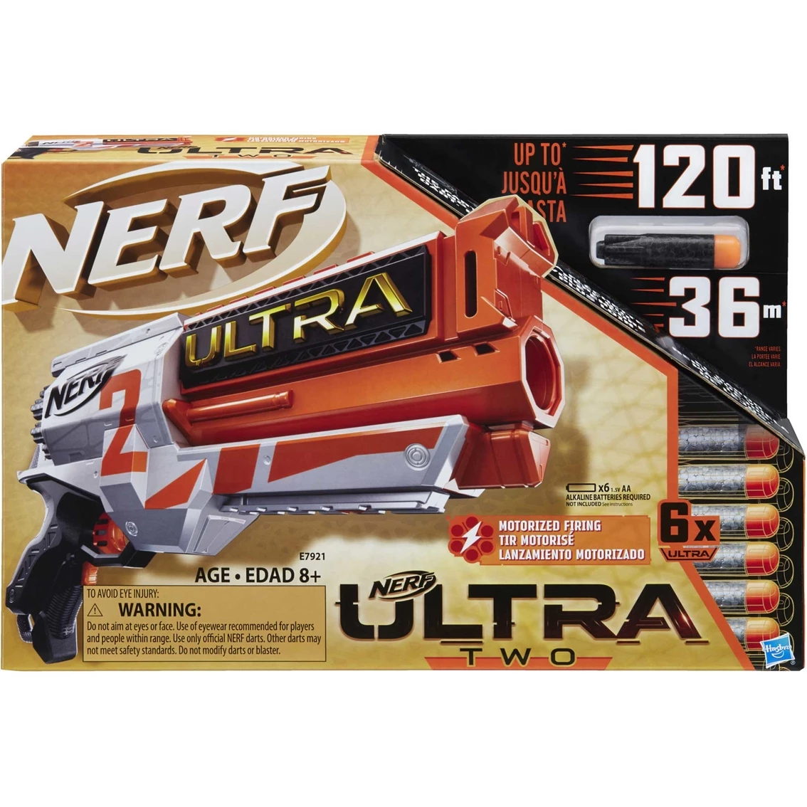 The Nerf Ultra Two Motorized Blaster features fast-back reloading. The 6-dart cylinder is open in the back, you can look inside to see how many darts are left to know when to reload. Hold down the acceleration button to power up the motor, and press the trigger to fire one dart. Includes six Nerf Ultra darts that are compatible only with Nerf Ultra blasters. Darts fly up to 120 ft. (36 m)! Distances based on controlled testing. Actual performance varies. Eyewear recommended (not included). Includes blaster, six darts and instructions. Model: E7921.