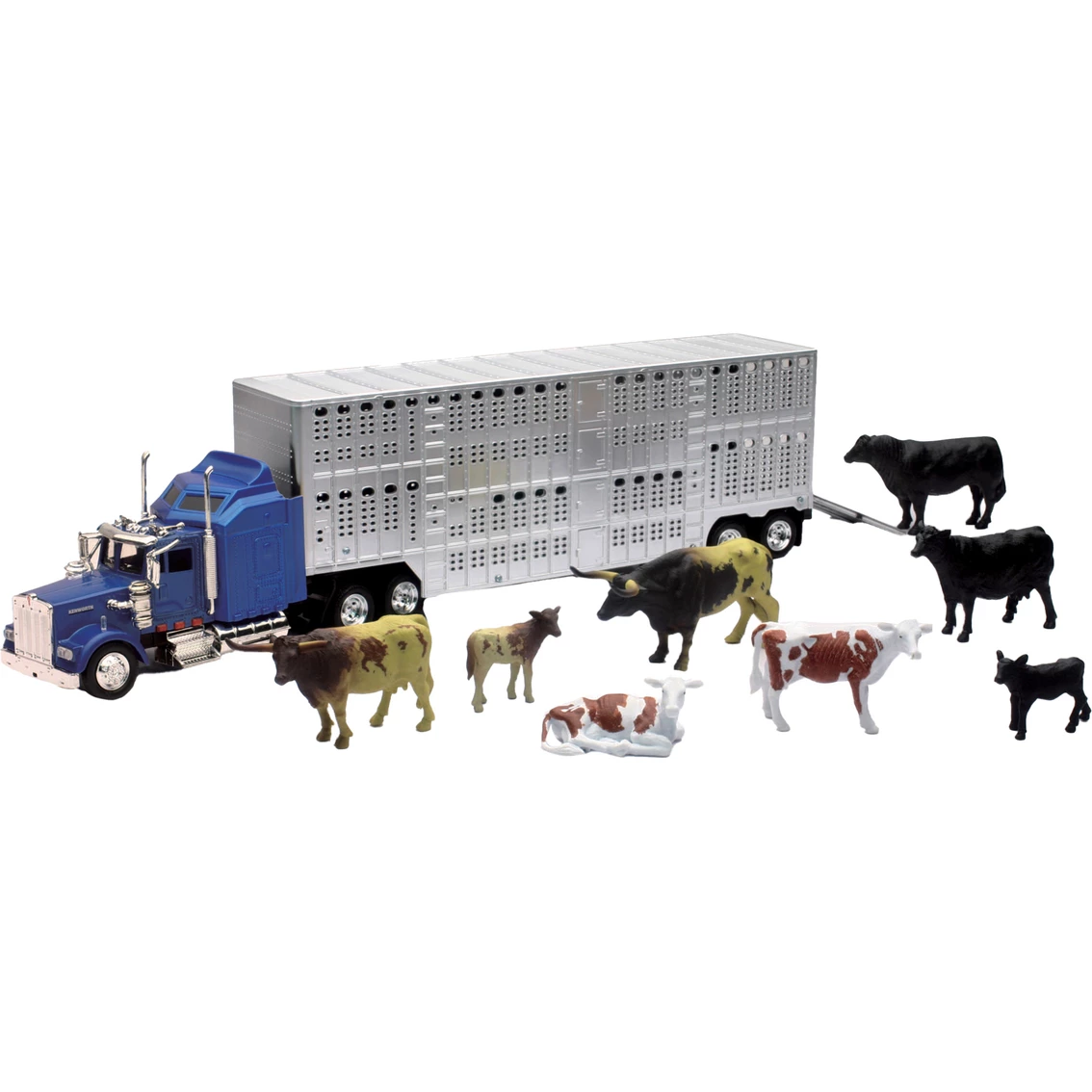 With a 1:43 scale, this playset comes complete with a die-cast semi cab with chrome accents, a plastic livestock trailer and 10 cattle, all ready for transport. The trailer features a drop-down ramp and the set is recommended for ages 8 and up. Model: SS 15365C.