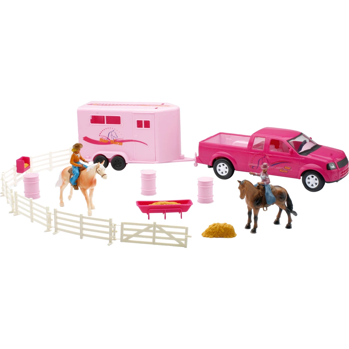 Featuring intricate details, the horse trailer has a drop down tailgate for easy loading of barrels, feeding station and corral fencing. The Pink Pick Up Truck & Trailer Horse Set comes with 2 horseback riding figures, barrels for barrel racing action, feeding station and corral fencing. Recommended for ages 2-4. Model: SS 37335A.