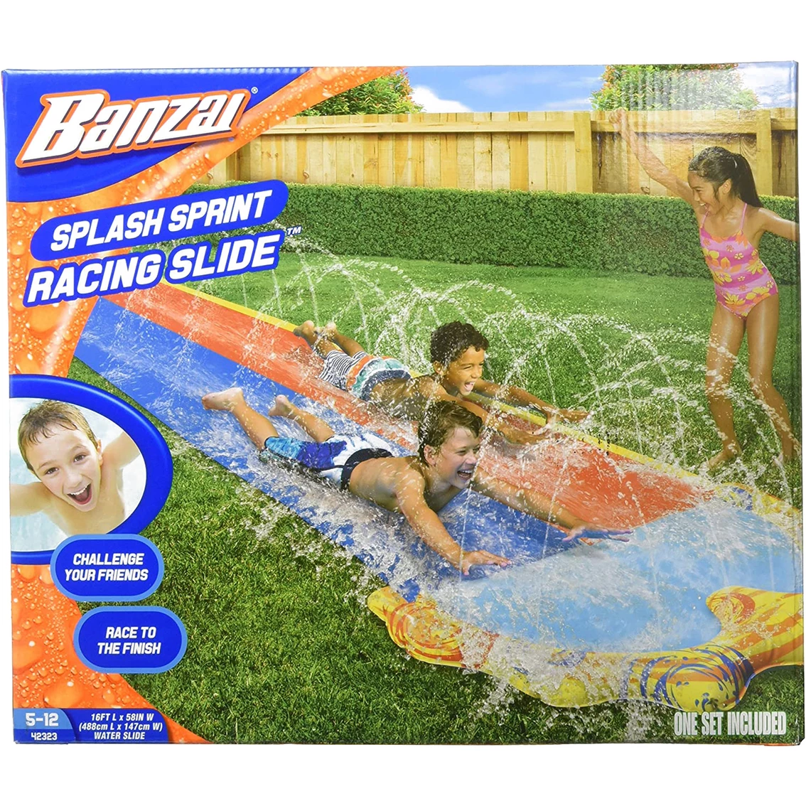 | Includes | Contents: 1 Splash Sprint Racing Slide, 2 inflatable body boards, 2 ground stakes and 1 repair patch |