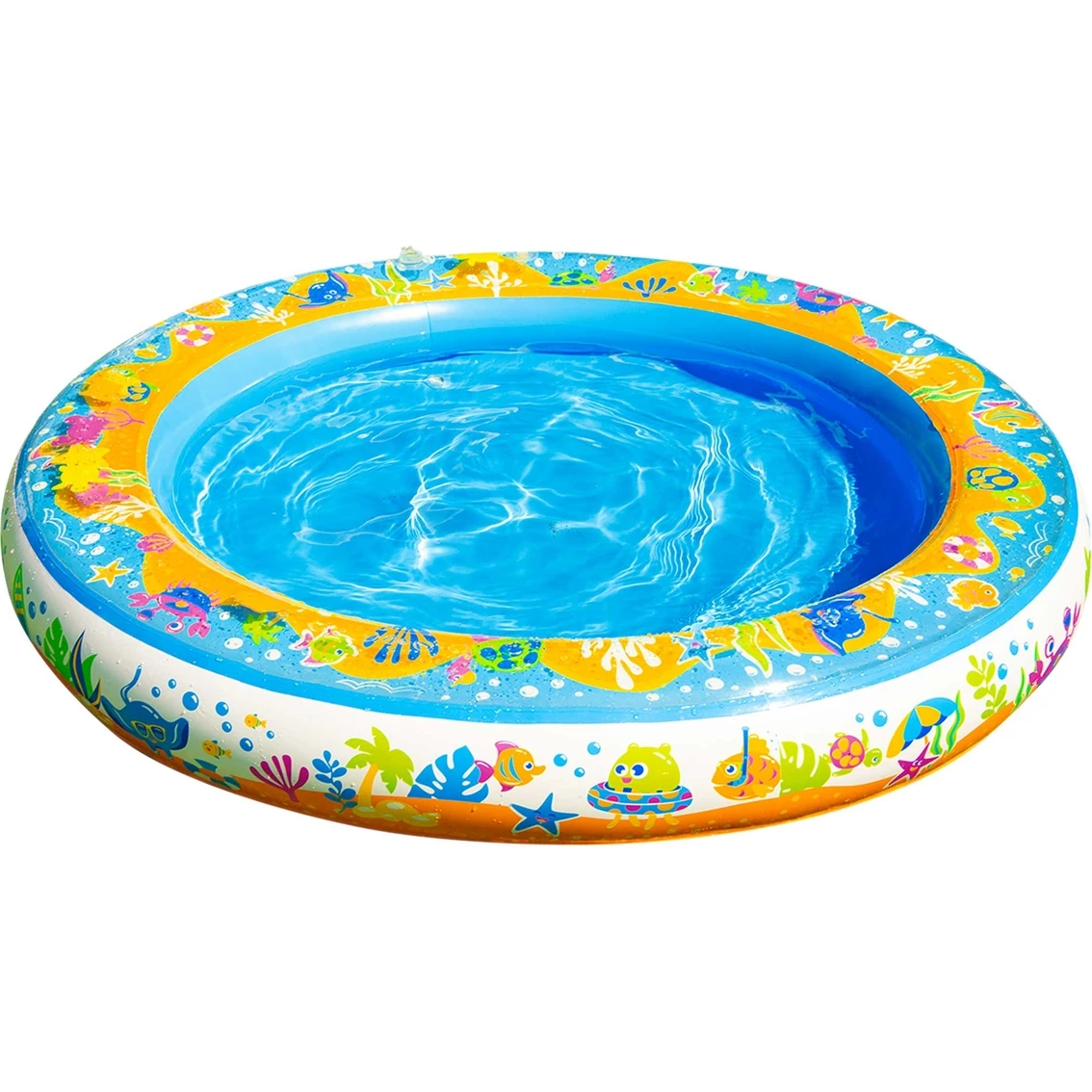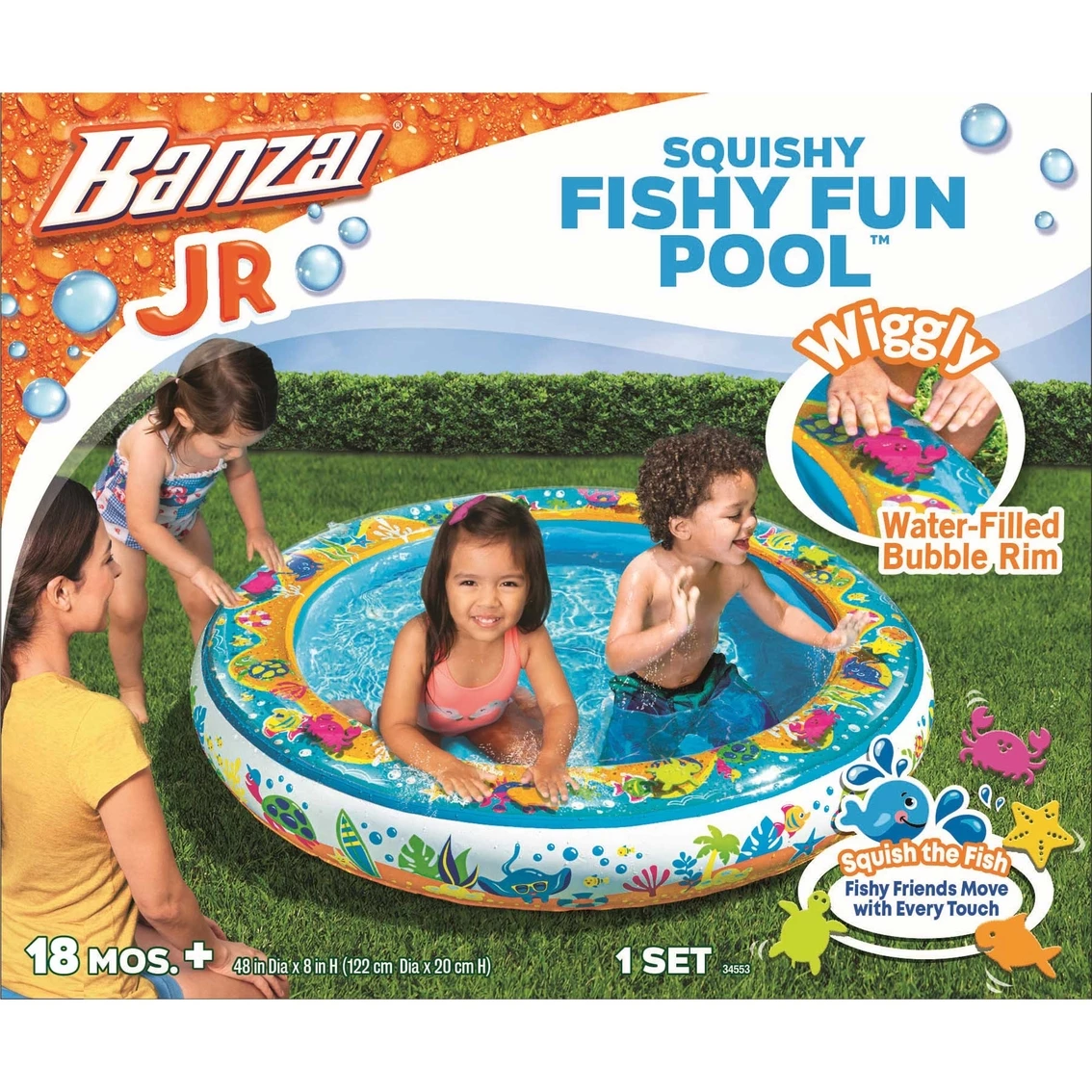 It’s Squishy Fishy Fun! Little ones will love to touch the water bubble rim of the Squishy Fishy Fun Pool! The water-filled rim wobbles and wiggles with every touch and features floating ocean friends that move with every squish. Bright, eye-catching graphics and foam ocean friends to squish encourage interactive play as your little ones splash and play all summer long! Water bubble pool rim with 8 EVA foam fishy cutouts. Fishy friends wobble and wiggle to the touch as little ones splash and play. Pool is 48 in. in diameter and 8.5 in. high. Tactile, interactive fun. Model: G191124345532.