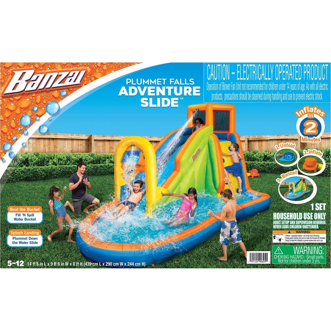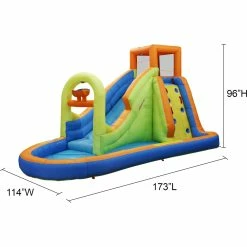 Inflated product size: 173 in. L X 114 in. W X 96 in. H. Comes with inflatable water slide, 1 Blower motor, 1 water spraying hose assembly, 3 blower ground stakes, 8 water slide ground stakes plus 1 extra, 1 carrying bag and 4 repair patches. Blower motor included. Inflate in under 2 minutes. Model: G191124903251.