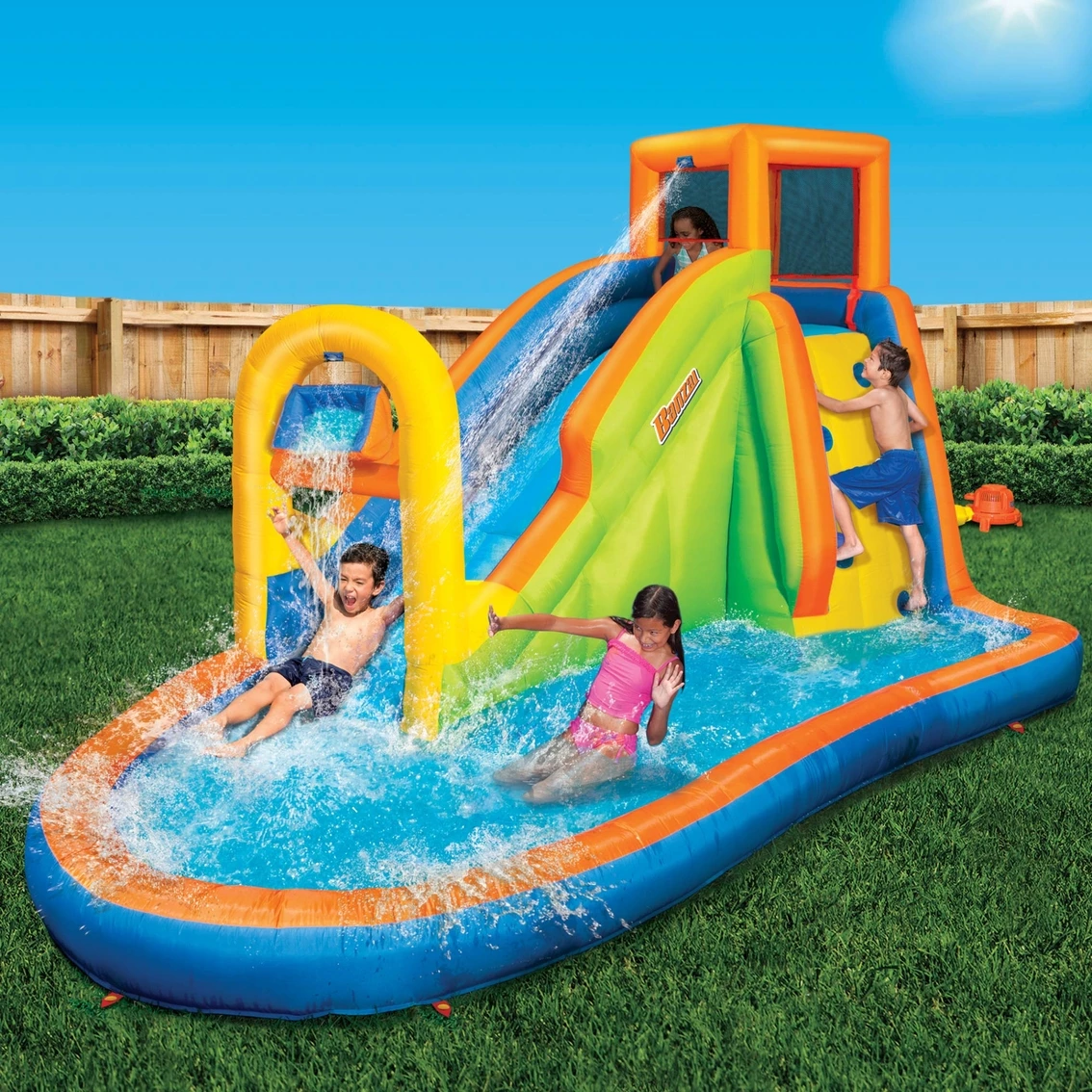 You will have hours of fun with this wet and wild water park! With the included continuous airflow blower, all of this fun inflates in under 2 minutes.