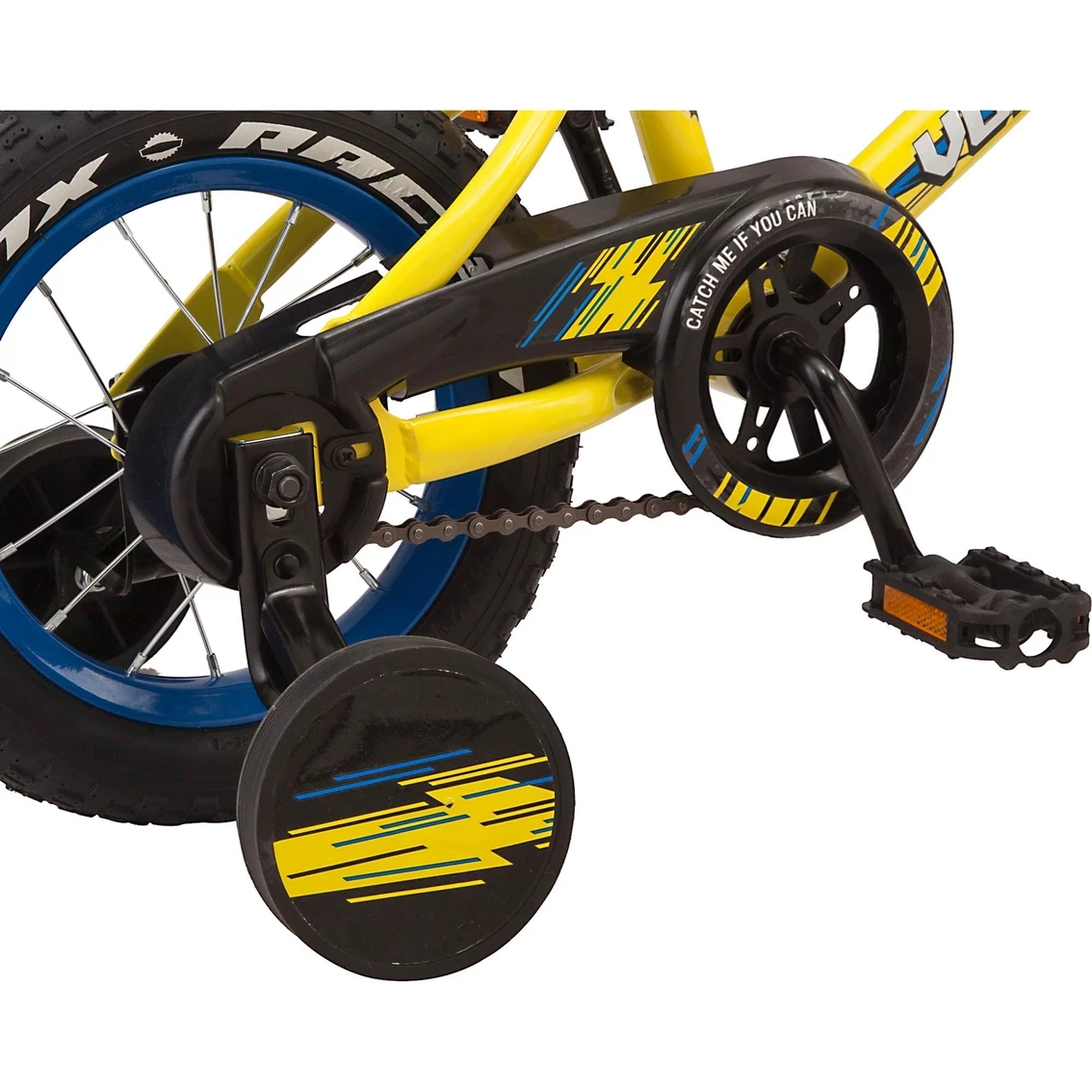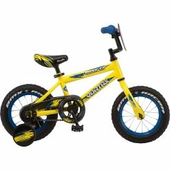 Learning to ride is loads of fun with the Vortax Kids Bike by Pacific. The Vortax’s durable steel frame features fun colors and rad graphics your child will love. The single speed drivetrain is easy to use and simple to maintain, while the rear coaster (pedal) brake provides intuitive stops. Plus, the removable training wheels over extra stability while your child learns to ride. Teach your child to ride on one of the coolest bikes in town with the Vortax by Pacific. Designed with 12-inch wheels, this bike fits riders ages 2 to 4, or 28 to 38 inches tall.