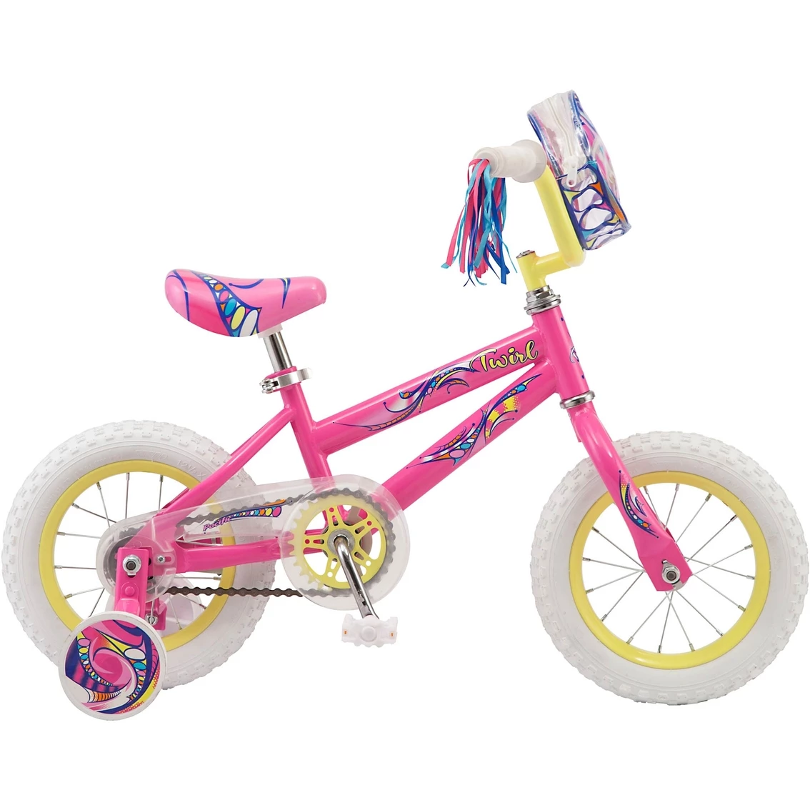 Learning to ride is loads of fun with the Twirl Kids Bike by Pacific. The Twirlโs durable steel frame features fun colors and delightful graphics your child will love. The single speed drivetrain is easy to use and simple to maintain, while the rear coaster (pedal) brake provides intuitive stops. Plus, the removable training wheels over extra stability while your child learns to ride. Teach your child to ride on one of the cutest bikes in town with the Twirl by Pacific. Designed with 12-inch wheels, this bike fits riders ages 2 to 4, or 28 to 38 inches tall.