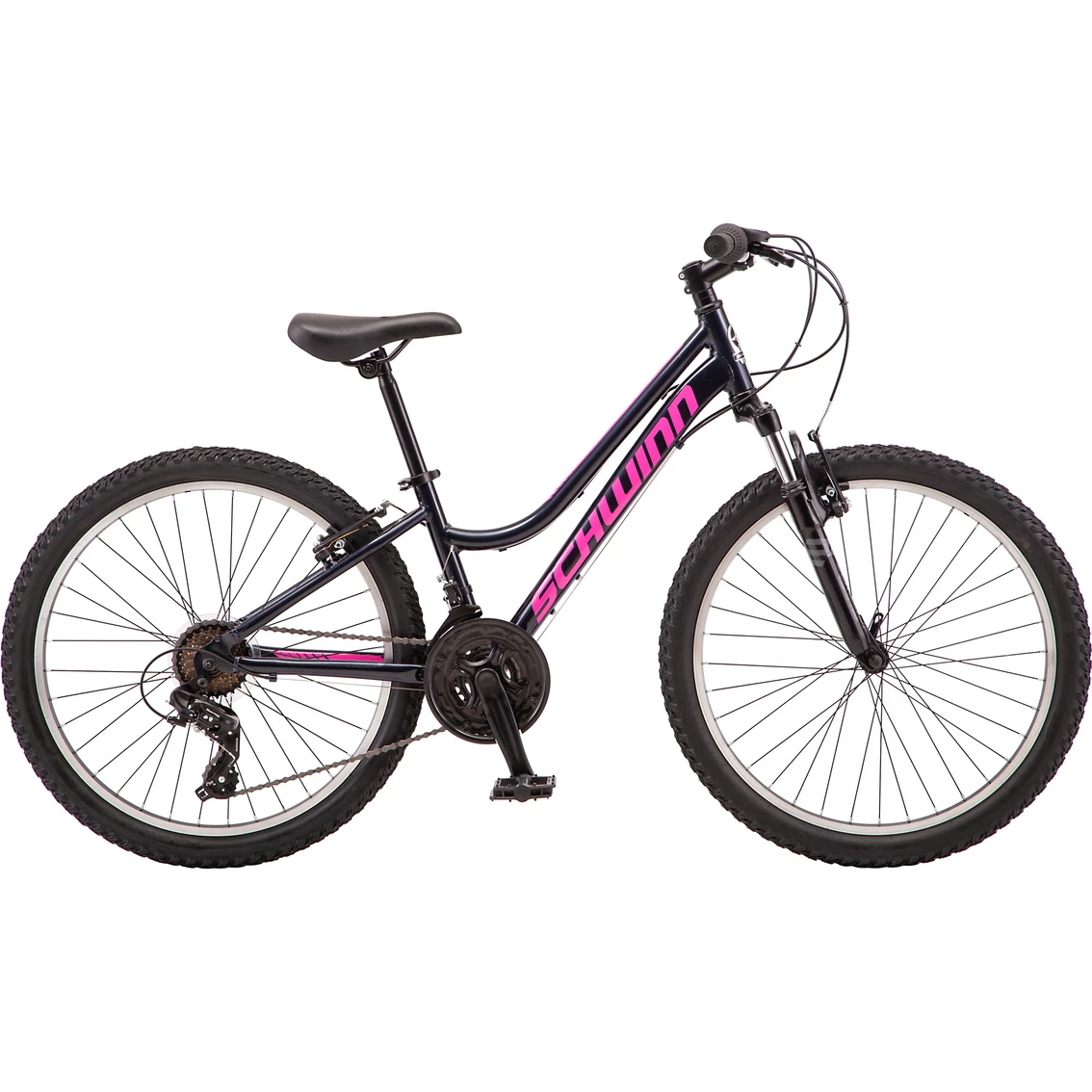 Explore new bike paths and light trails with the Timber Trail AL mountain bike by Schwinn. This bike comes with an aluminum hardtail frame and suspension fork for controlled riding. The Shimano 21-speed twist shifters and rear derailleur provide effortless gear changes, while alloy linear pull brakes deliver reliable stopping power. Plus, the quick release seat post makes it easy to fine tune the fit. Like all Schwinn bikes, the Timber Trail AL comes with a limited lifetime warranty for as long as you own the bike. The trails are waiting; go and explore with Timber Trail AL. Enjoy the freedom of riding a Schwinn. 24-inch wheels fit riders 4 feet 8 inches to 5 feet 0 inches in height.