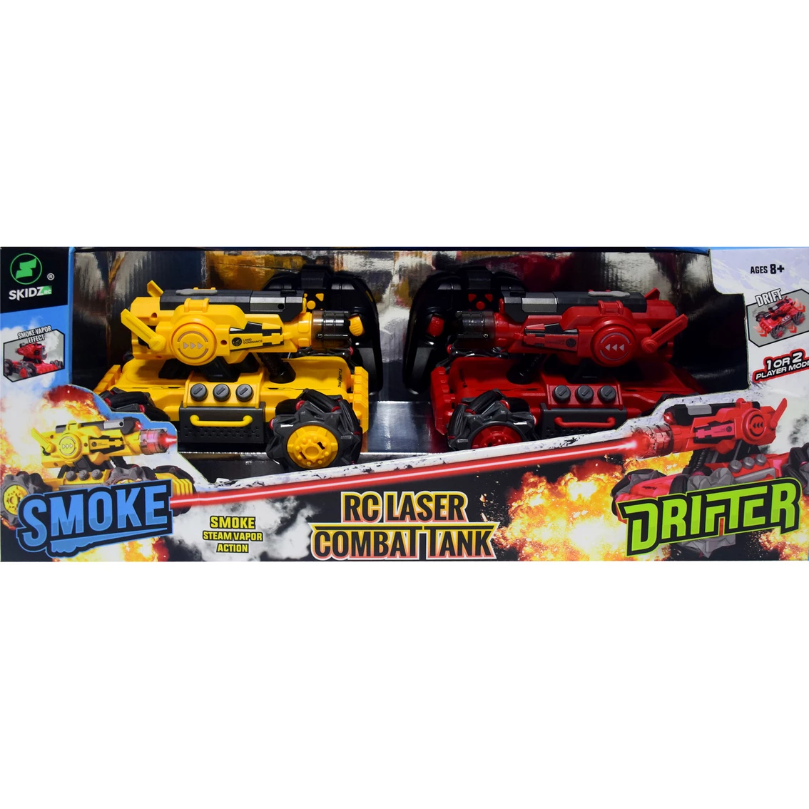 This long range set of 2 combat drifter RC tanks from Skidz RC can be played by two people. These remote control toys have a smoke effect with four wheel drive. This Drift Battle Tank makes 360 degree turns for complete maneuverability. For kids ages 8 years old and up. Model: MT1100/4.