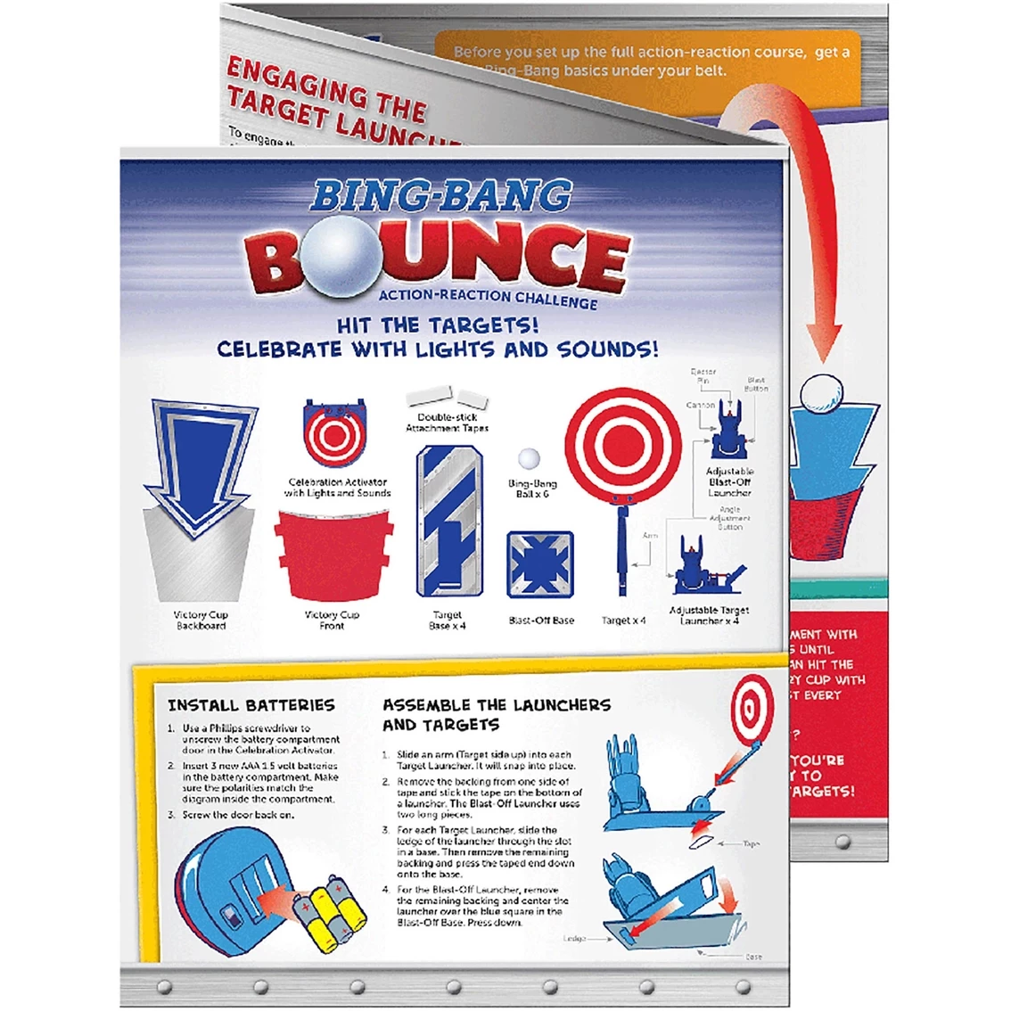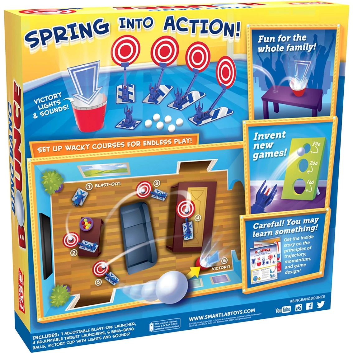 WARNING: This kind of fun draws a crowd! This extreme action-reaction Bing Bang Bounce Game from Smart Lab Toys provides hours of fun and experimentation for all ages! Play on your own or with a group. Set up the Blast-Off Launcher and the four Target Launchers to create exciting obstacle courses or invent new games. Players will learn about trajectories, angles, momentum, and game design as they play. Launch your Bing-Bang Ball into the Victory Cup and celebrate with flashing lights and sounds. No matter what, you are sure to have a BLAST! Requires 3-AAA batteries (sold separately). STEM focus: Engineering and Physics. Age – 7 and up. Model: 194925.