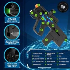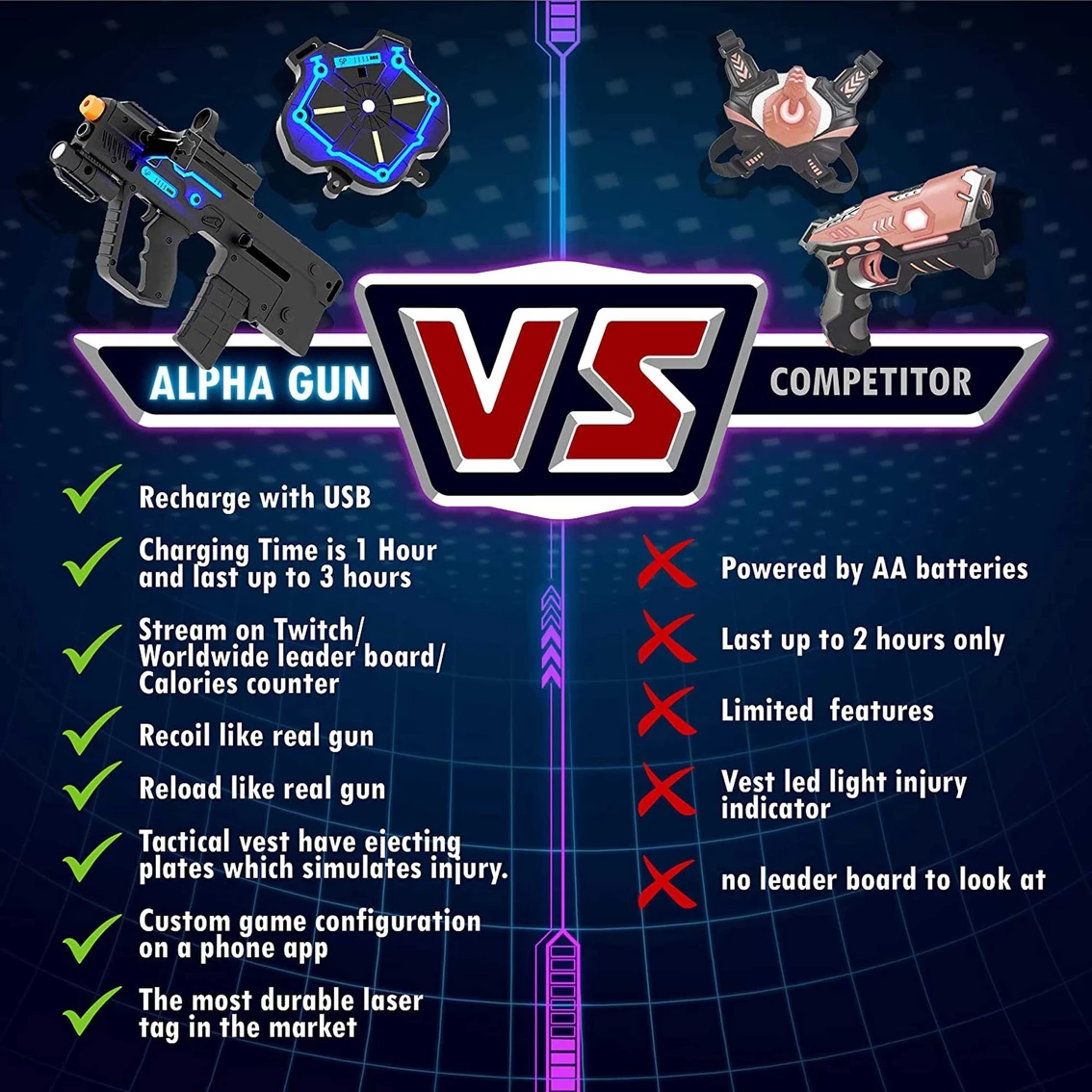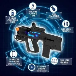 This item includes everything that one player needs for an exciting, unforgettable round of realistic laser tag. Every kit comes with our realistic and rugged gun, an easy to strap on vest with ejecting discs, a mountable flashlight & cell phone holder, and a USB cable to recharge the included lithium batteries.