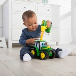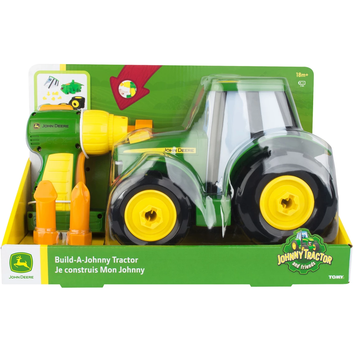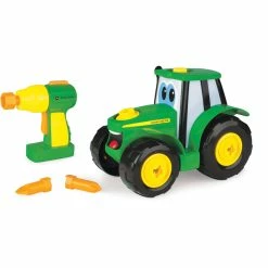 The Tomy Build-A-Johnny Tractor features two ways to play; free rolling tractor or buildable set. This 16-piece set includes a battery powered drill to take apart and build the Johnny Tractor back together again. Made of chunky parts, easy for little hands to assemble. Includes power drill with 2 bits and 13 Johnny Tractor pieces. Ages 18 months and up. Produced by Tomy and officially licensed by John Deere. Model: 46655.