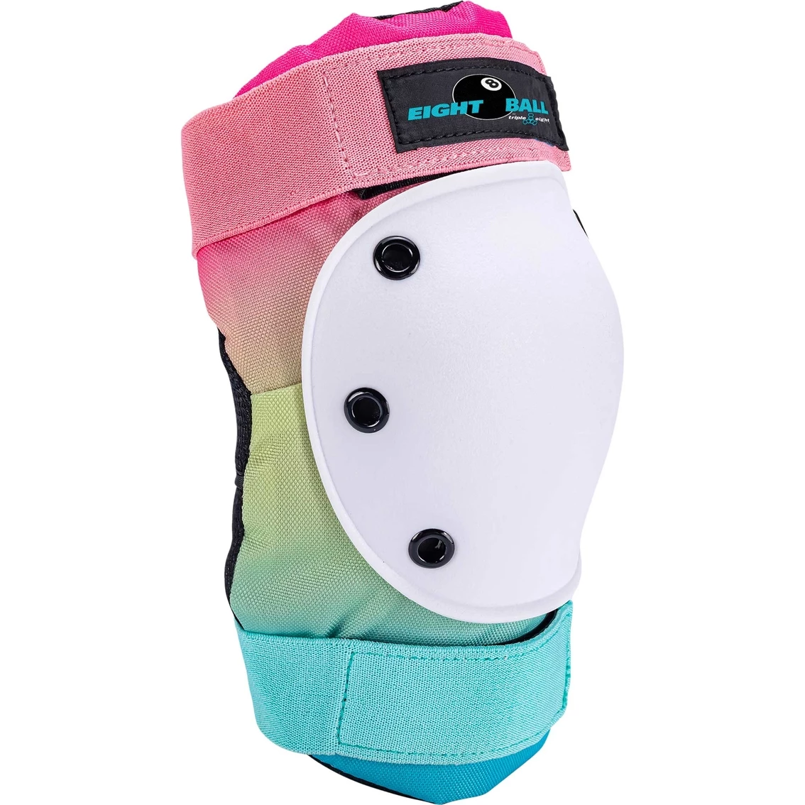 The Eight Ball Multi-Sport Pad Set with Wrist guards, Elbow Pads and Knee Pads offers maximum protection, comfort, and mobility for biking, skateboarding, rollerblading, roller skating and scooters. Each pad set includes two wrist guards, two elbow pads and two knee pads for total multi-sport coverage. Inspired by the ergonomic designs of industry leading action sports brand Triple Eight, the lightweight contoured pads feature shock absorbing EVA foam for cushioning and mobility, and a tough abrasion-resistant nylon body for durability. High-density, impact-resistant caps are securely anchored with reinforced rivets for maximum protection of children’s wrists, elbows and knees. Wrist guards, elbow pads and knee pads have adjustable top and bottom straps for a secure fit. Model: 62134.