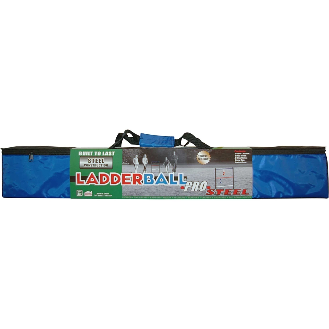 Ladderball Pro Steel is America’s favorite bola game built tough! Ladderball Pro Steel construction is built to last. You’ll have hours of enjoyment playing this easy to learn family game from University Games. Designed for indoor and outdoor play, Ladderball Pro Steel is ideal for tailgating, family reunions, parties, camping or the beach. Safe soft plastic bolas are official size and weight to play like real golf balls. Model: 53902.