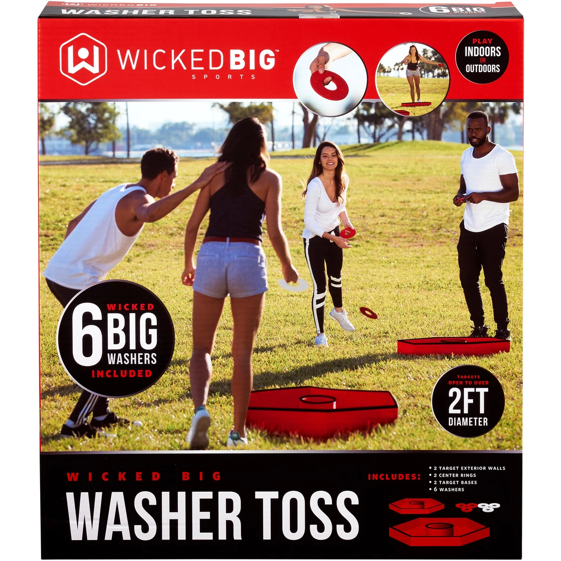 This is the classic Washer Toss but bigger and better from Wicked Big Sports. Targets unfold to 2 ft. in diameter. Includes 2 target exterior walls, 2 center rings, 2 target bases and 6 washers. Each washer is 5 in. diameter. Model: 968.