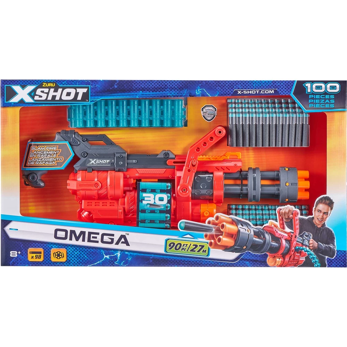 The Zuru X-shot Omega is the ultimate blaster you have been waiting for. You can annihilate your opponents with the single shot function from up to 90 ft./27m away. When the heat of battle intensifies, unleash your 30-dart belt with Slam-Fire and take out the enemy with an inferno of flying darts. You can blast up to 4-darts per second during Slam-Fire mode and see your auto-rotating barrel release our award-winning X- Shot darts. Once you empty your dart belt, simply refill and get back into the action!